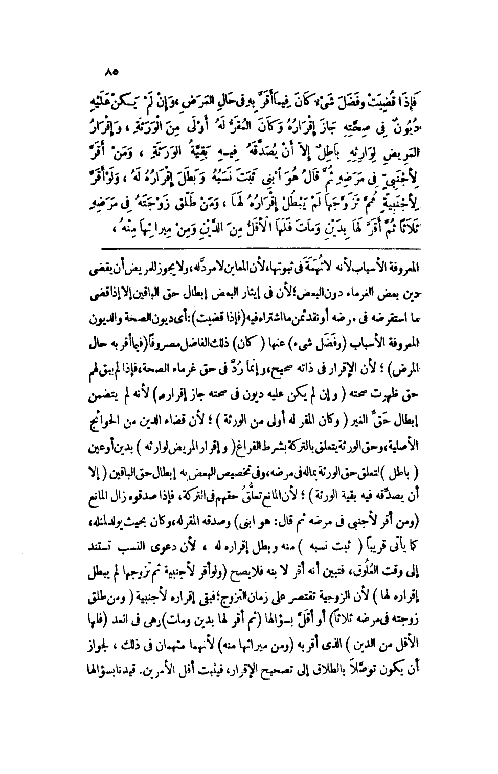 فإذا قضيت وفضل شيءٌ كان فيما أقر به في حال المرض، وإن لم يكن عليه ديونٌ في صحته جاز إقراره وكان المقر له أولى من الورثة، وإقرار المريض لوارثه باطلٌ إلا أن يصدقه فيه بقية الورثة، ومن أقر لأجنبيٍ في مرضه ثم قال هو ابني ثبت نسبه وبطل إقراره له، ولو أقر لأجنبيةٍ ثم تزوجها لم يبطل إقراره لها، ومن طلق زوجته في مرضه ثلاثاً ثم أقر لها بدين ومات فلها الأقل من الدين ومن ميراثها منه،