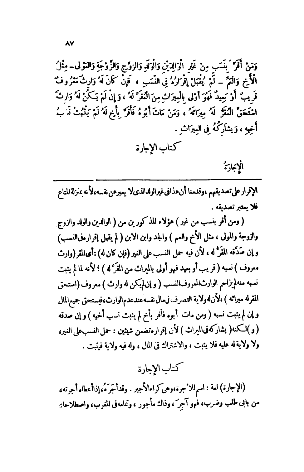 ومن أقر بنسبٍ من غير الوالدين والولد والزوج والزوجة والمولى - مثل الأخ والعم - لم يقبل إقراره في النسب، فإن كان له وارثٌ معروفٌ قريبٌ أو بعيدٌ فهو أولى بالميراث من المقر له، وإن لم يكن له وارثٌ استحق المقر له ميراثه، ومن مات أبوه فأقر بأخٍ له لم يثبت نسب أخيه ويشاركه في الميراث.