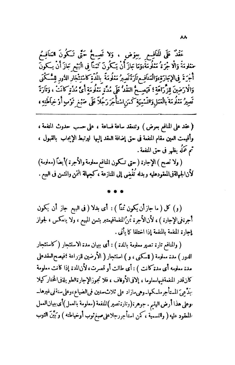 (عقد على المنافع بعوض) وتنعقد ساعة فساعة، على حسب حدوث المنفعة، وأقيمت العين مقام المنفعة في حق إضافة العقد إليها ليرتبط الإيجاب بالقبول، ثم عمله يظهر في حق المنفعة.