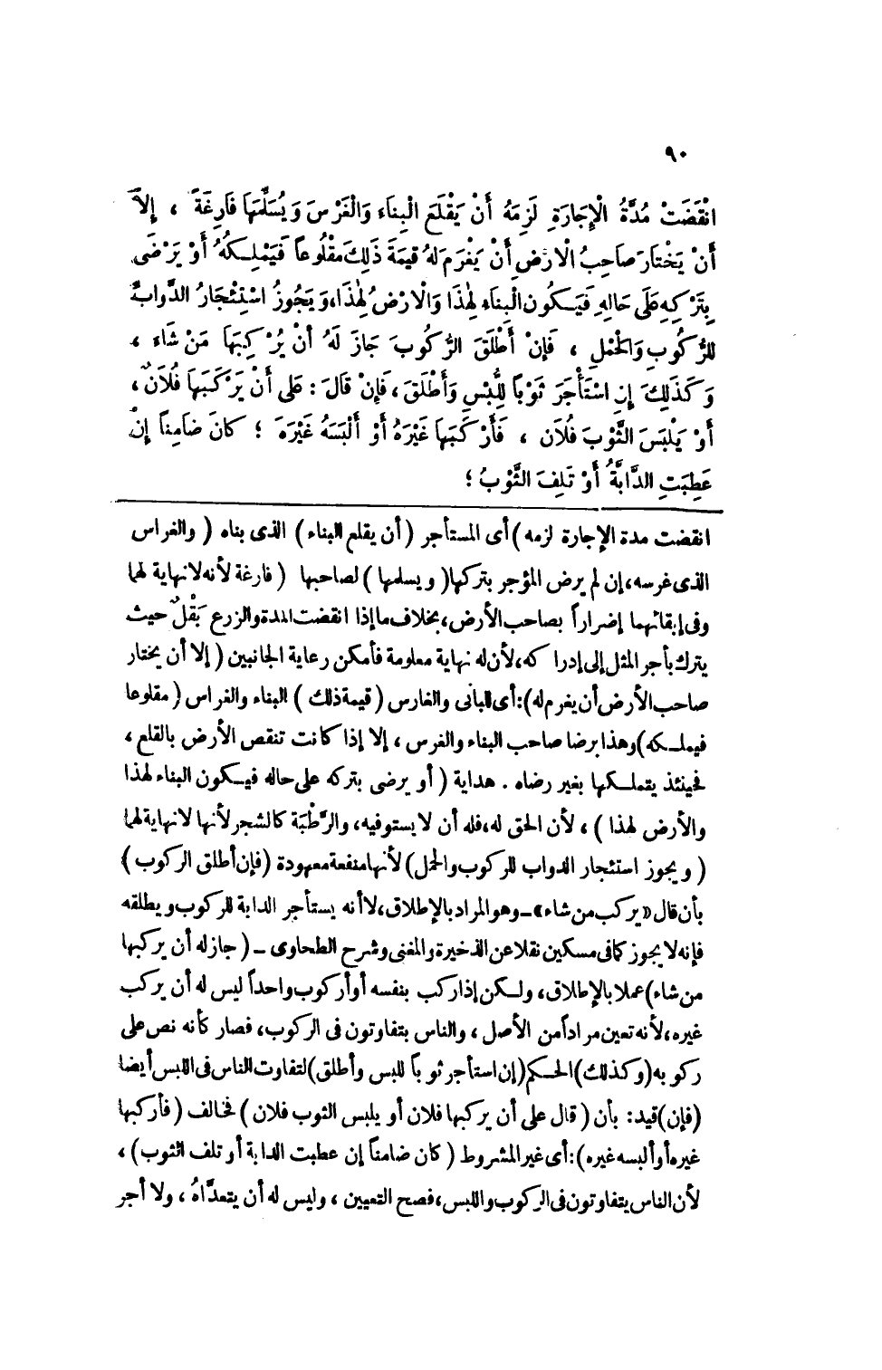 انقضت مدة الإجارة لزمه أن يقلع البناء والغرس ويسلمها فارغةً، إلا أن يختار صاحب الأرض أن يغرم له قيمة ذلك مقلوعاً فيملكه أو يرضى بتركه على حاله فيكون البناء لهذا والأرض لهذا، ويجوز استئجار الدواب للركوب والحمل، فإن أطلق الركوب جاز له أن يركبها من شاء، وكذلك إن استأجر ثوباً للبس وأطلق، فإن قال: على أن يركبها فلانٌ، أو يلبس الثوب فلانٌ، فأركبها غيره أو ألبسه غيره؛ كان ضامناً إن عطبت الدابة أو تلف الثوب؛