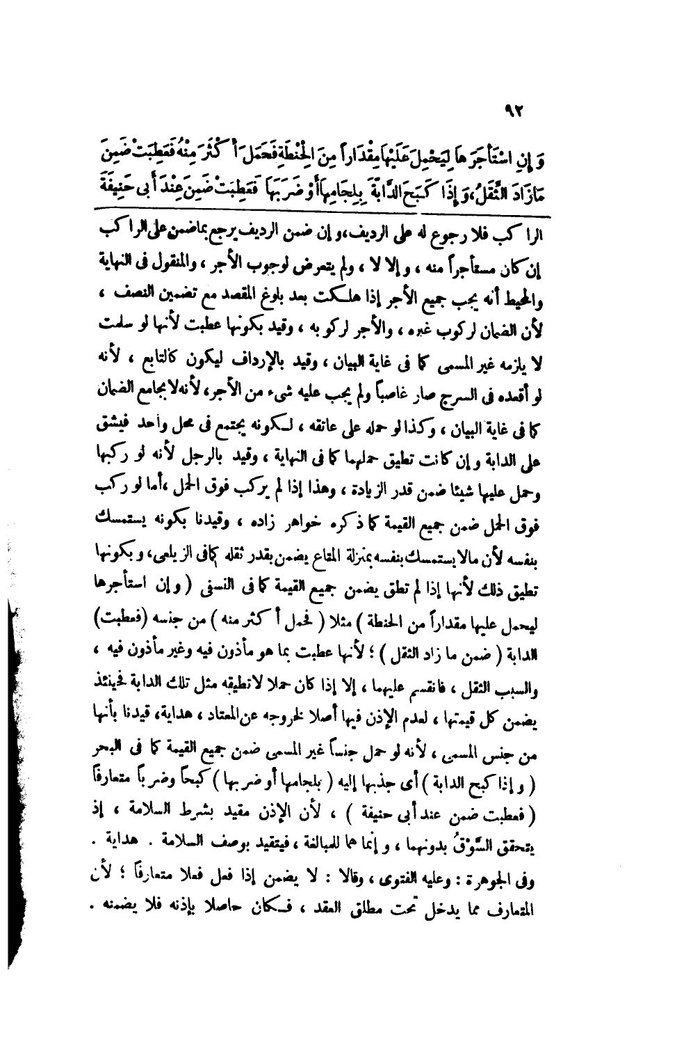 الراكب فلا رجوع له على الرديف، وإن ضمن الرديف يرجع بما ضمن على الراكب إن كان مستأجراً منه، وإلا لا، ولم يتعرض لوجوب الأجر، والمنقول في النهاية والمحيط أنه يجب جميع الأجر إذا هلكت بعد بلوغ المقصد مع تضمين النصف، لأن الضمان لركوب غيره، والأجر لركوبه، وقيد بكونها عطبت لأنها لو سلمت لا يلزمه غير المسمى كما في غاية البيان، وقيد بالإرداف ليكون كالتابع، لأنه لو أقعده في السرج صار غاصباً ولم يجب عليه شيء من الأجر، لأنه لا بجامع الضمان كما في غاية البيان، وكذا لو حمله على عاتقه، لكونه يجتمع في محل واحد فيشق على الدابة وإن كانت تطيق حملهما كما في النهاية، وقيد بالرجل لأنه لو ركبها وحمل عليها شيئا ضمن قدر الزيادة، وهذا إذا لم يركب فوق الحمل، أما لو ركب فوق الحمل ضمن جميع القيمة كما ذكره جواهر زاده، وقيدنا بكونه يستمسك بنفسه لأن ما لا يستمسك بنفسه بمنزلة المتاع يضمن بقدر ثقله كما في الزيلعي، وبكونها تطيق ذلك لأنها إذا لم تطق يضمن جميع القيمة كما في النسفي (وإن استأجرها ليحمل عليها مقداراً من الحنطة) مثلا (فحمل أكثر منه) من جنسه (فعطبت) الدابة (ضمن ما زاد الثقل) ؛ لأنها عطبت بما هو مأذون فيه وغير مأذون فيه، والسبب الثقل، فانقسم عليهما، إلا إذا كان حملا لا تطيقه مثل تلك الدابة فحينئذ يضمن كل قيمتها، لعدم الإذن فيها أصلا لخروجه عن المعتاد، هداية، قيدنا بأنها من جنس المسمى، لأنه لو حمل جنساً غير المسمى ضمن جميع القيمة كما في البحر (وإذا كبح الدابة) أي جذبها إليه (بلجامها أو ضربها) كبحاً وضرباً متعارفاً (فعطبت ضمن عند أبي حنيفة) ، لأن الإذن مقيد بشرط السلامة، إذ يتحقق السوق بدونهما، وإنما هما للمبالغة، فيتقيد بوصف السلامة. هداية.