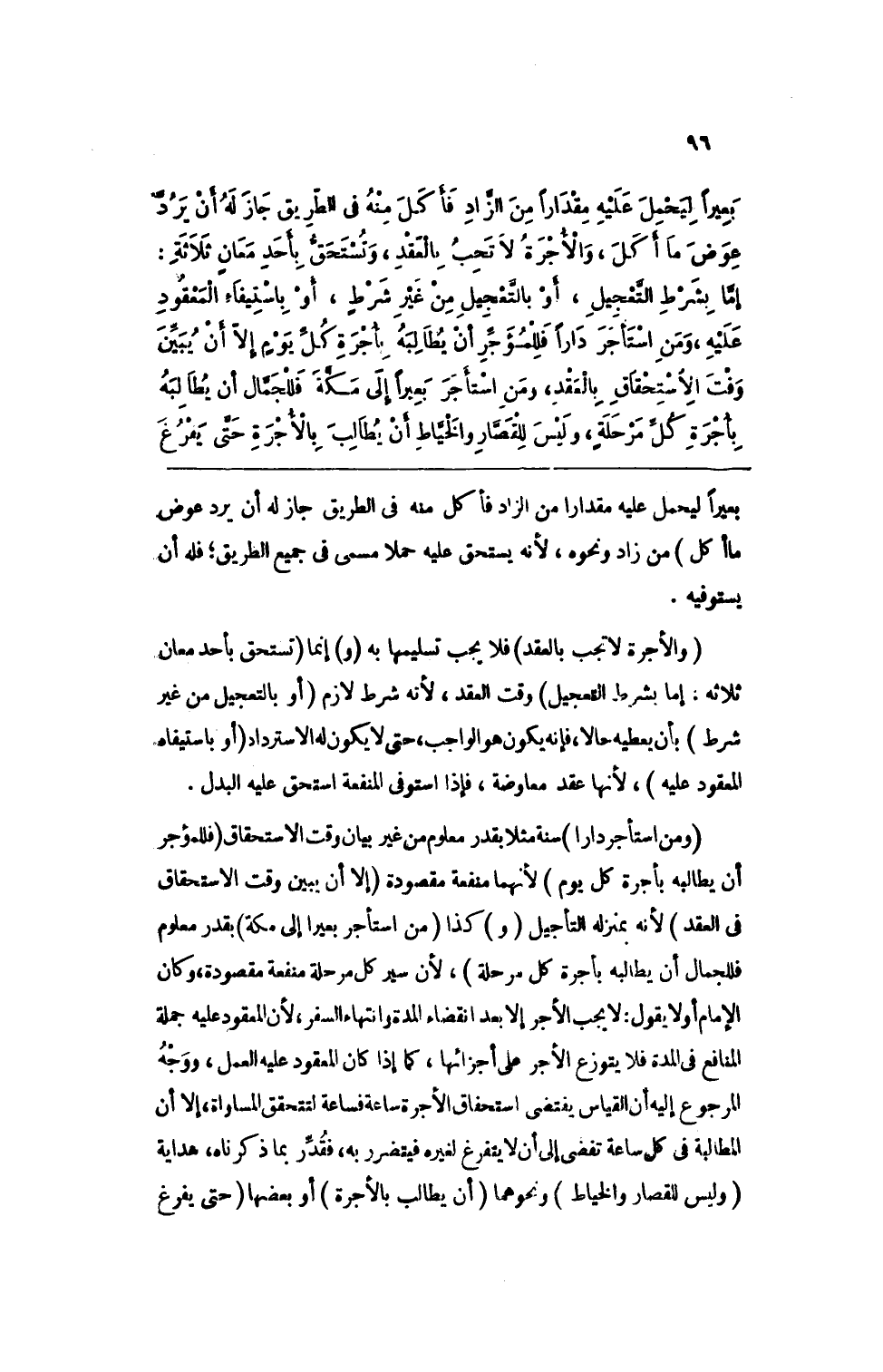بعيراً ليحمل عليه مقداراً من الزاد فأكل منه في الطريق جاز له أن يرد عوض ما أكل، والأجرة لا تجب بالعقد، وتستحق بأحد معانٍ ثلاثةٍ: إما بشرط التعجيل. أو بالتعجيل من غير شرطٍ، أو باستيفاء المعقود عليه، ومن استأجر داراً فللمؤجر أن يطالبه بأجرة كل يومٍ إلا أن يبين وقت الاستحقاق بالعقد، ومن استأجر بعيراً إلى مكة فللجمال أن يطالبه بأجرة كل مرحلةٍ، وليس للقصار والخياط أن يطالب بالأجرة حتى يفرغ
