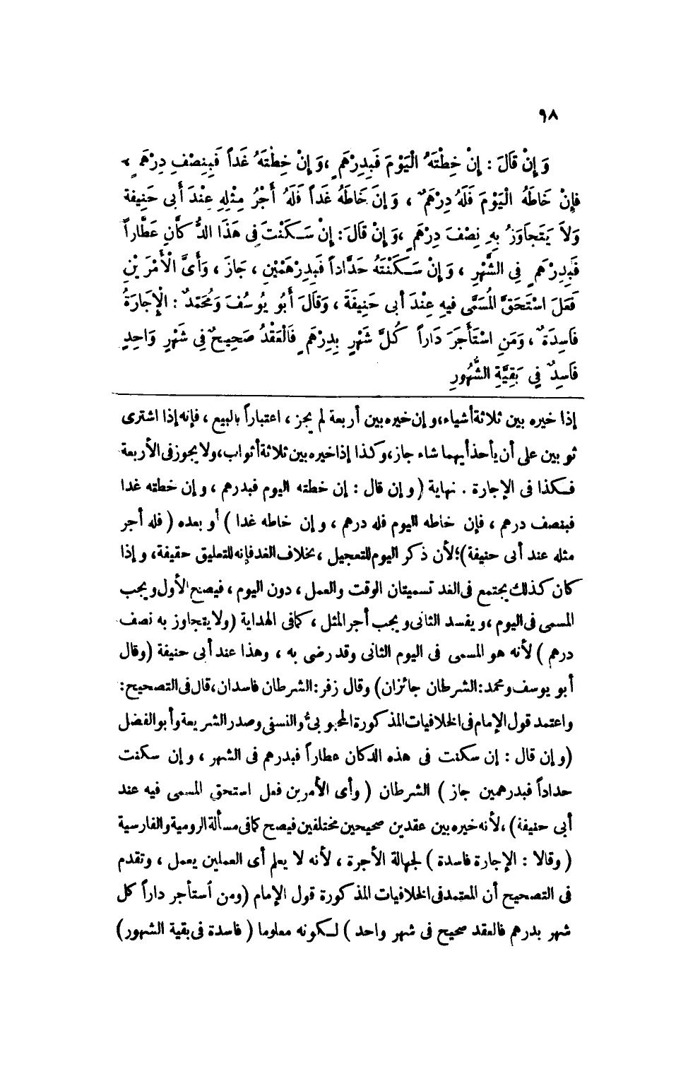 وإن قال: إن خطته اليوم فبدرهمٍ، وإن خطته غداً فبنصف درهمٍ، فإن خاطه اليوم فله درهمٌ، وإن خاطه غداً فله أجر مثله عند أبي حنيفة ولا يتجاوز به نصف درهمٍ، وإن قال: إن سكنت في هذا الدكان عطاراً فبدرهمٍ في الشهر، وإن سكنته حداداً فبدرهمين، جاز، وأي الأمرين فعل استحق المسمى فيه عند أبي حنيفة، وقال أبو يوسف ومحمدٌ: الإجارة فاسدةٌ، ومن استأجر داراً كل شهرٍ بدرهمٍ فالعقد صحيحٌ في شهرٍ واحدٍ فاسدٌ في بقية الشهور.
