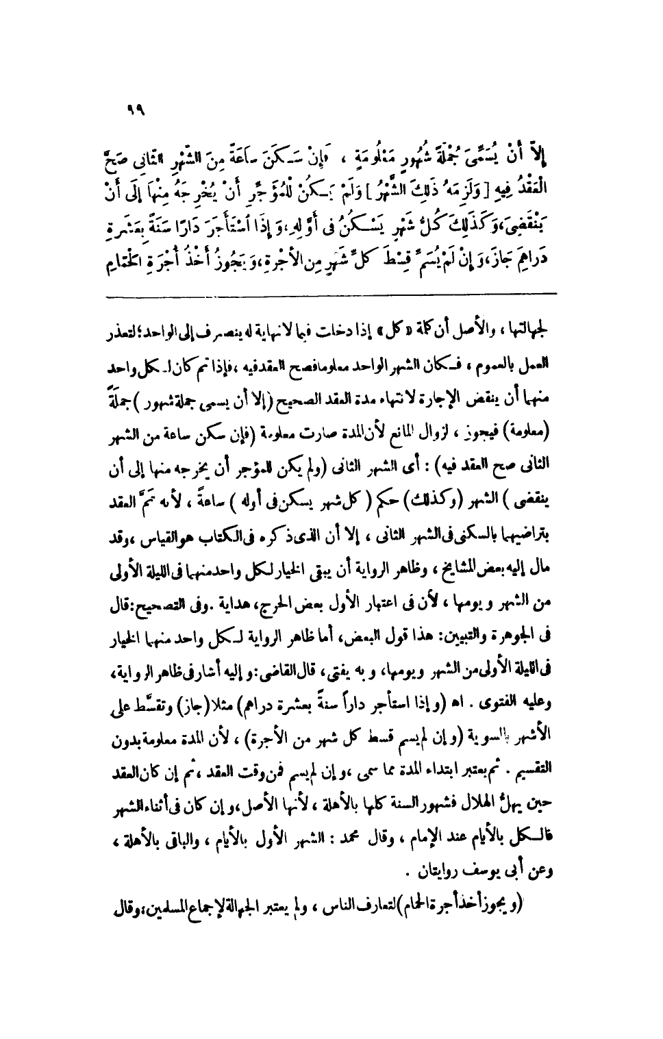لجهالتها، والأصل أن كلمة "كل" إذا دخلت فيما لا نهاية له ينصرف إلى الواحد؛ لتعذر العمل بالعموم، فكان الشهر الواحد معلوما فصح العقد فيه، فإذا تم كان لكل واحد منهما أن ينقض الإجارة لانتهاء مدة العقد الصحيح (إلا أن يسمى جملة شهور) جملةً (معلومة) فيجوز، لزوال المانع لأن المدة صارت معلومة (فإن سكن ساعة من الشهر الثاني صح العقد فيه) : أي الشهر الثاني (ولم يكن للمؤجر أن يخرجه منها إلى أن ينقضي) الشهر (وكذلك) حكم (كل شهر يسكن في أوله) ساعةً، لأنه تم العقد بتراضيهما بالسكنى في الشهر الثاني، إلا أن الذي ذكره في الكتاب هو القياس، وقد مال إليه بعض المشايخ، وظاهر الرواية أن يبقى الخيار لكل واحد منهما في الليلة الأولى من الشهر ويومها، لأن في اعتبار الأول بعض الحرج، هداية. وفي التصحيح: قال في الجوهرة والتبيين: هذا قول البعض، أما ظاهر الرواية لكل واحد منهما الخيار في الليلة الأولى من الشهر ويومها، وبه يفتى، قال القاضي: وإليه أشار في ظاهر الرواية، وعليه الفتوى. اهـ (وإذا استأجر داراً سنةً بعشرة دراهم) مثلا (جاز) وتقسط على الأشهر بالسوية (وإن لم يسم قسط كل شهر من الأجرة) ، لأن المدة معلومة بدون التقسيم. ثم يعتبر ابتداء المدة مما سمى، وإن لم يسم فمن وقت العقد، ثم إن كان العقد حين يهل الهلال فشهور السنة كلها بالأهلة، لأنها الأصل، وإن كان في أثناء الشهر فالكل بالأيام عند الإمام، وقال محمد: الشهر الأول بالأيام، والباقي بالأهلة، وعن أبي يوسف روايتان.