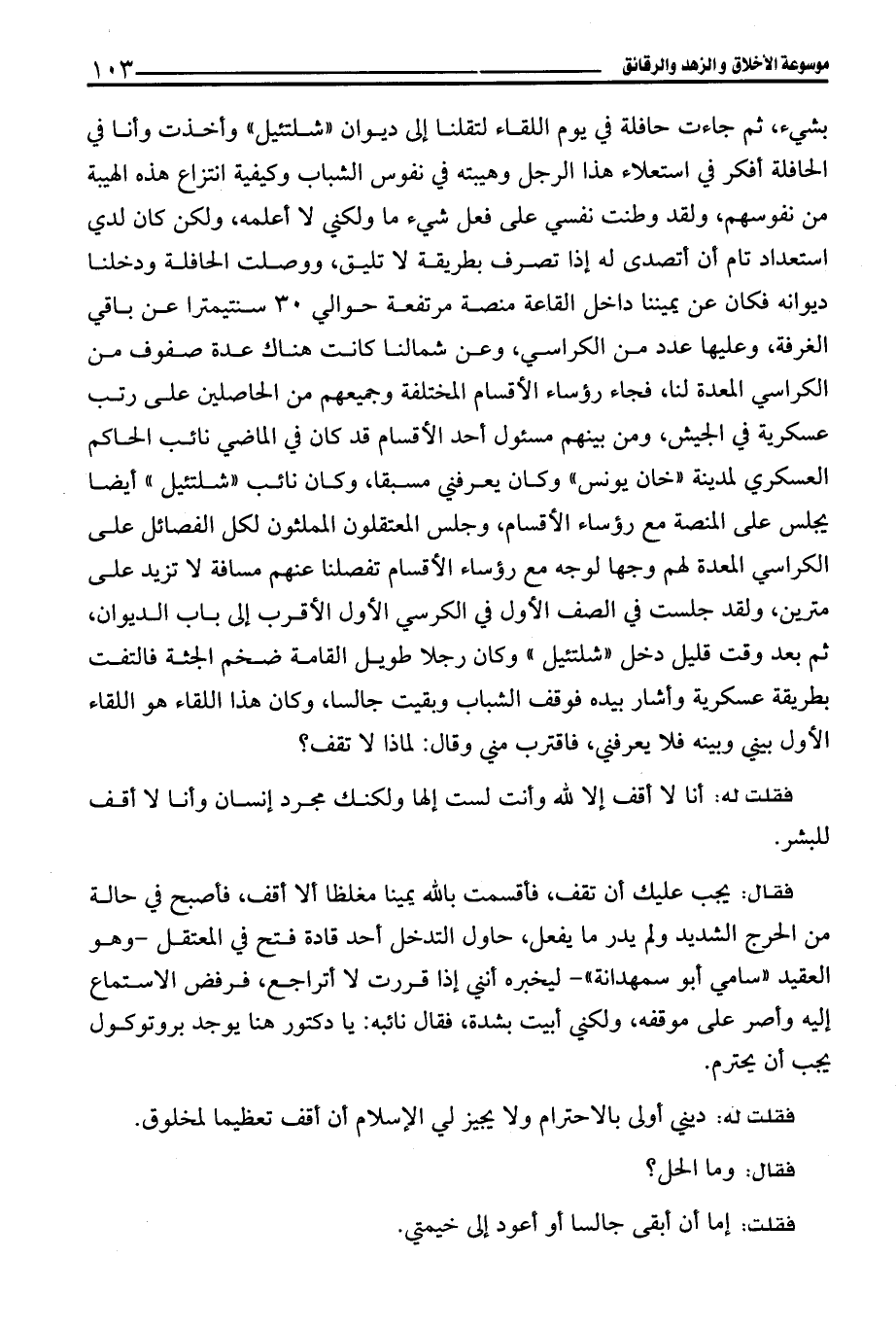 بشيء، ثم جاءت حافلة في يوم اللقاء لتقلنا إلى ديوان "شلتئيل" وأخذت وأنا في الحافلة أفكر في استعلاء هذا الرجل وهيبته في نفوس الشباب وكيفية انتزاع هذه الهيبة من نفوسهم، ولقد وطنت نفسي على فعل شيء ما ولكني لا أعلمه، ولكن كان لدي استعداد تام أن أتصدى له إذا تصرف بطريقة لا تليق، ووصلت الحافلة ودخلنا ديوانه فكان عن يميننا داخل القاعة منصة مرتفعة حوالي 30 سنتيمترا عن باقي الغرفة، وعليها عدد من الكراسي، وعن شمالنا كانت هناك عدة صفوف من الكراسي المعدة لنا، فجاء رؤساء الأقسام المختلفة وجميعهم من الحاصلين على رتب عسكرية في الجيش، ومن بينهم مسئول أحد الأقسام قد كان في الماضي نائب الحاكم العسكري لمدينة "خان يونس" وكان يعرفني مسبقا، وكان نائب "شلتئيل" أيضا يجلس على المنصة مع رؤساء الأقسام، وجلس المعتقلون المملثون لكل الفصائل على الكراسي المعدة لهم وجها لوجه مع رؤساء الأقسام تفصلنا عنهم مسافة لا تزيد على مترين، ولقد جلست في الصف الأول في الكرسي الأول الأقرب إلى باب الديوان، ثم بعد وقت قليل دخل "شلتئيل" وكان رجلا طويل القامة ضخم الجثة فالتفت بطريقة عسكرية وأشار بيده فوقف الشباب وبقيت جالسا، وكان هذا اللقاء هو اللقاء الأول بيني وبينه فلا يعرفني، فاقترب مني وقال: لماذا لا تقف؟