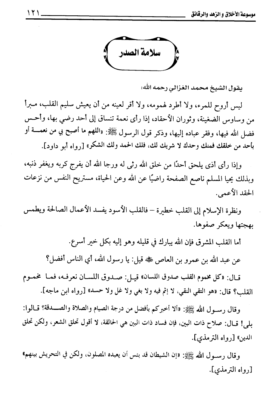 ليس أروح للمرء، ولا أطرد لهمومه، ولا أقر لعينه من أن يعيش سليم القلب، مبرأ من وساوس الضغينة، وثوران الأحقاد، إذا رأى نعمة تنساق إلى أحد رضي بها، وأحس فضل الله فيها، وفقر عباده إليها، وذكر قول الرسول - صلى الله عليه وسلم -:"اللهم ما أصبح بي من نعمة أو بأحد من خلقك فمنك وحدك لا شريك لك، فلك الحمد ولك الشكر" [رواه أبو داود].