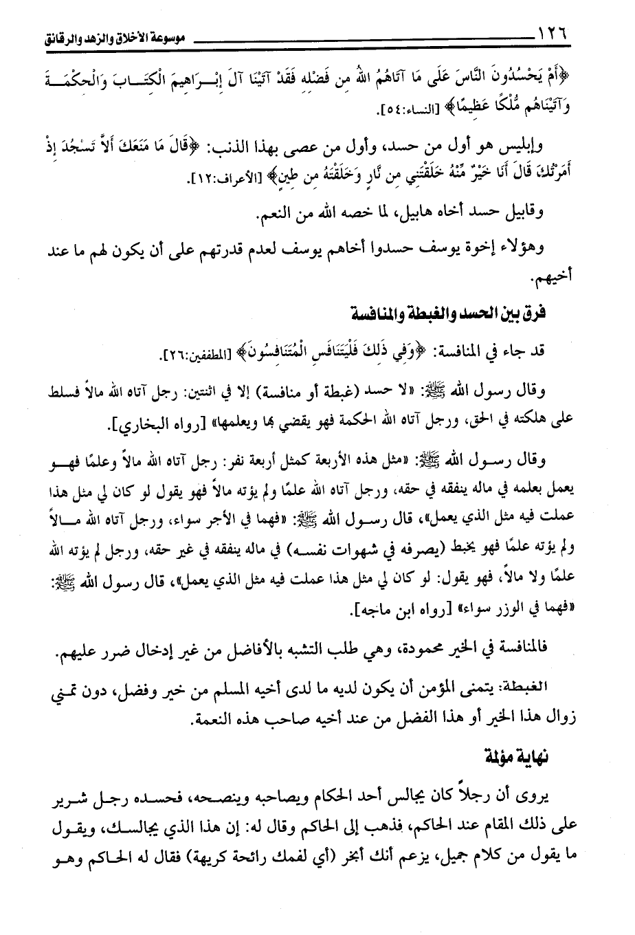 وقال رسول الله - صلى الله عليه وسلم -: "لا حسد (غبطة أو منافسة) إلا في اثنتين: رجل آتاه الله مالاً فسلط على هلكته في الحق، ورجل آتاه الله الحكمة فهو يقضي بها ويعلمها" [رواه البخاري].