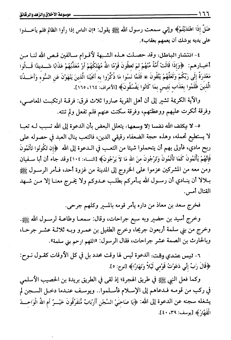 5 - لا يكلف الله نفسا إلا وسعها: يتعلل البعض بأن الدعوة إلى الله تسبب له تعبا لا يستطيع تحمله، وهذه حجة الضعفاء رقيقي الدين، فالتعب ينال العبد في حصوله على ربح مادي، فأولى بهم أن يتحملوا شيئا من التعب في الدعوة إلى الله {إِنْ تَكُونُوا تَأْلَمُونَ فَإِنَّهُمْ يَأْلَمُونَ كَمَا تَأْلَمُونَ وَتَرْجُونَ مِنَ اللَّهِ مَا لَا يَرْجُونَ} [النساء: 104] وقد جاء أن أبا سفيان ومن معه من المشركين عزموا على الخروج إلى المدينة من غزوة أحد، فأمر الرسول - صلى الله عليه وسلم - بلالا أن ينادي أن رسول الله يأمركم بطلب عدوكم ولا يخرج معنا إلا من شهد القتال أمس.