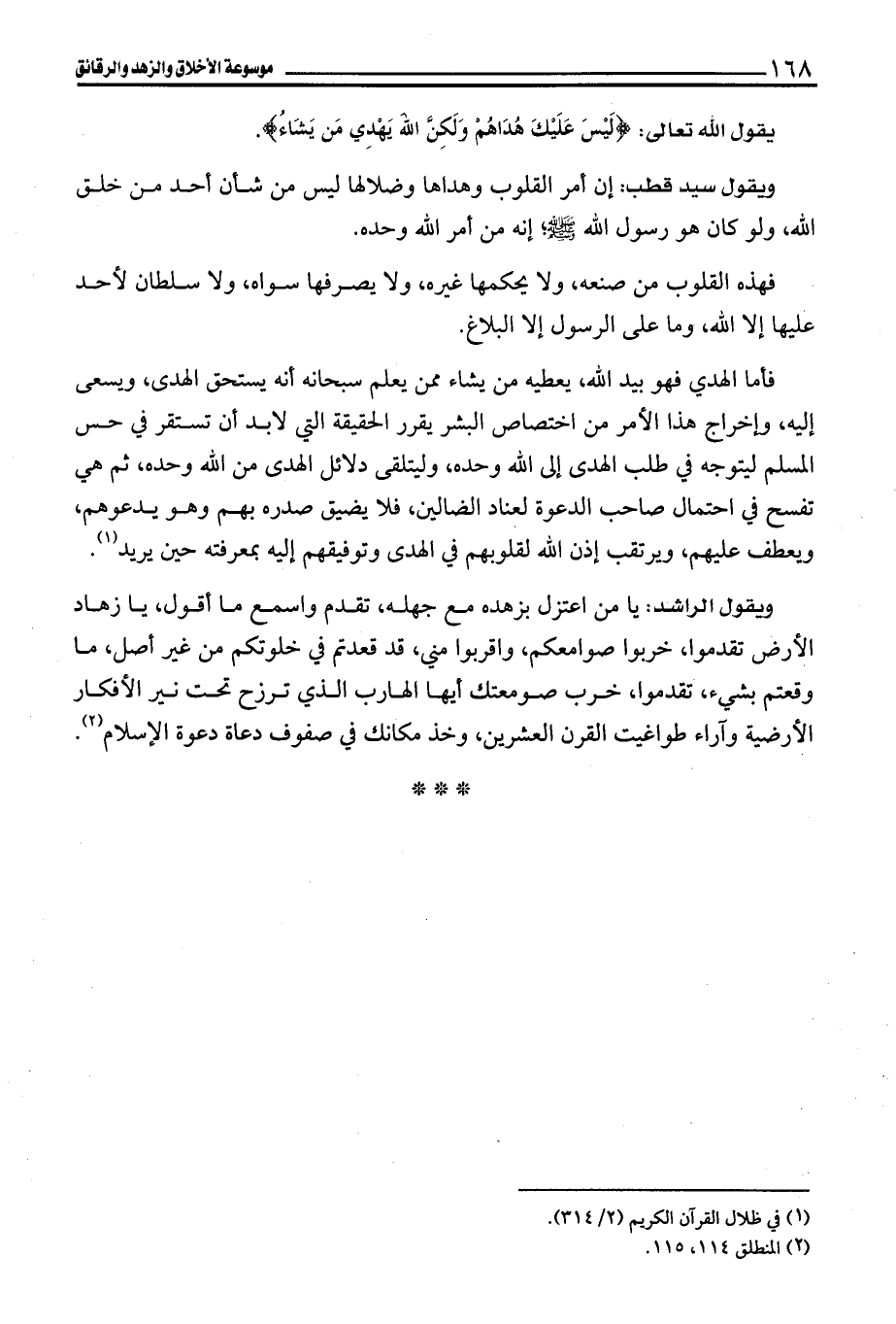 ويقول سيد قطب: إن أمر القلوب وهداها وضلالها ليس من شأن أحد من خلق الله، ولو كان هو رسول الله - صلى الله عليه وسلم - إنه من أمر الله وحده.