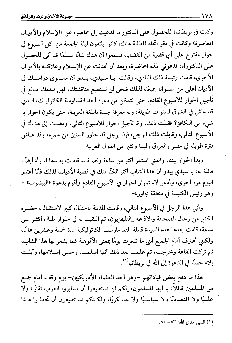 وكنت في بريطانيا؛ للحصول على الدكتوراه، فدعيت إلى محاضرة عن "الإسلام والأديان المعاصرة" وكانت في مقر اتحاد للطلبة هناك، كانوا يلتقون ليلة الجمعة من كل أسبوع في حوار مفتوح على أي قضية من القضايا، فسمعوا أن هناك شابًا مسلمًا قد أتى للحصول على الدكتوراه، فدعوني لهذه المحاضرة، وبعد أن تحدثت عن الإسلام وعلاقته بالأديان الأخرى، قامت رئيسة ذلك النادي، وقالت: يا سيدي، يبدو أن مستوى دراستك في الأديان أعلى من مستوانا جميعًا، لذلك فنحن لن نستطيع مناقشتك، فهل لديك مانع في تأجيل الحوار للأسبوع القادم، حتى نتمكن من دعوة أحد القساوسة الكاثوليك، الذي قد عاش في الشرق لسنوات طويلة، وله معرفة جيدة باللغة العربية، حتى يكون الحوار به شيء من التكافؤ؟ فقبلت ذلك، وتم تأجيل الحوار للأسبوع التالي، وذهبت إلى هناك في الأسبوع التالي، وقابلت ذلك الرجل، فإذا برجل قد جاوز الستين من عمره، وقد عاش فترة طويلة في مصر والعراق وليبيا وكثير من الدول العربية.
