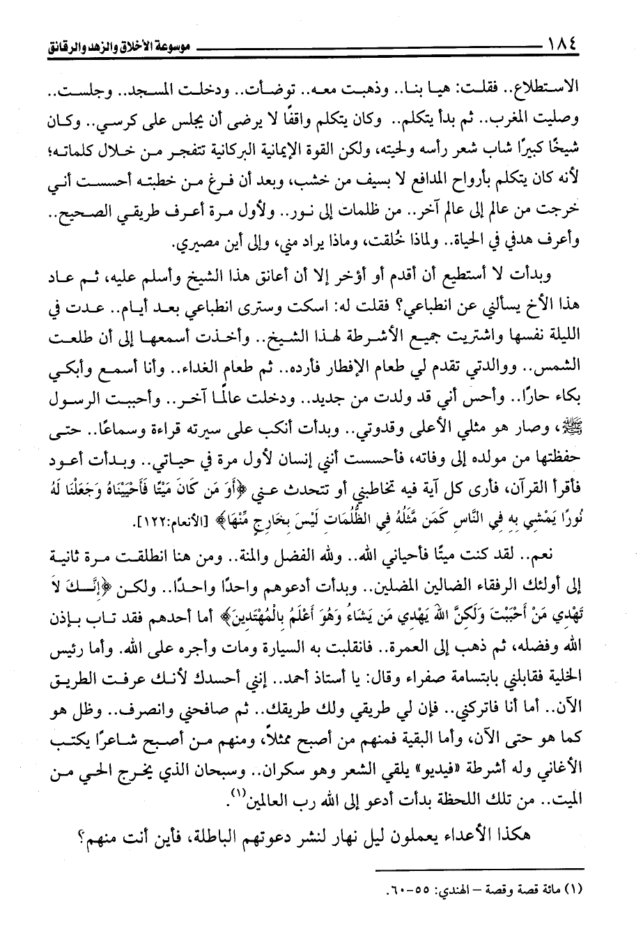 الاستطلاع .. فقلت: هيا بنا .. وذهبت معه .. توضأت .. ودخلت المسجد .. وجلست .. وصليت المغرب .. ثم بدأ يتكلم .. وكان يتكلم واقفًا لا يرضى أن يجلس على كرسي .. وكان شيخًا كبيرًا شاب شعر رأسه ولحيته، ولكن القوة الإيمانية البركانية تتفجر من خلال كلماته؛ لأنه كان يتكلم بأرواح المدافع لا بسيف من خشب، وبعد أن فرغ من خطبته أحسست أني خرجت من عالم إلى عالم آخر .. من ظلمات إلى نور .. ولأول مرة أعرف طريقي الصحيح .. وأعرف هدفي في الحياة .. ولماذا خُلقت، وماذا يراد مني، وإلى أين مصيري.