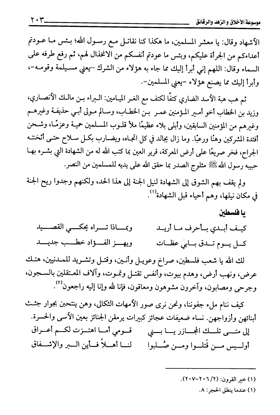 لك الله يا شعب فلسطين، صراخ وعويل وأنين، وقتل وتشريد للمدنيين، هتك عرض، ونهب أرض، وهدم بيوت، وأنفس تقتل وتموت، وآلاف المعتقلين بالسجون، وجرحى ومصابون، وآخرون مشوهون ومعاقون، فإنا لله وإنا إليه راجعون (¬2).