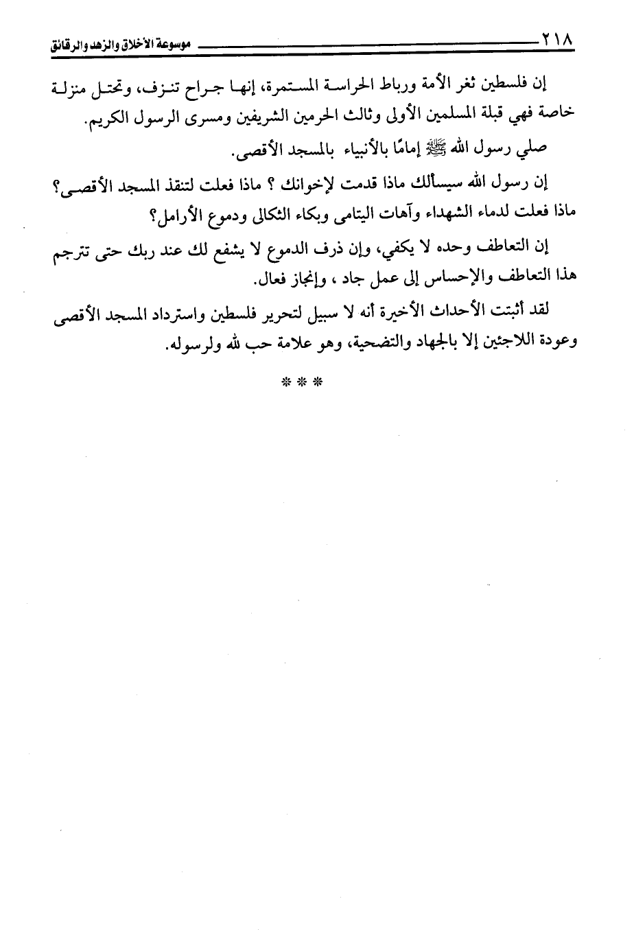إن رسول الله سيسألك ماذا قدمت لإخوانك؟ ماذا فعلت لتنقذ المسجد الأقصى؟ ماذا فعلت لدماء الشهداء وآهات اليتامى وبكاء الثكالى ودموع الأرامل؟