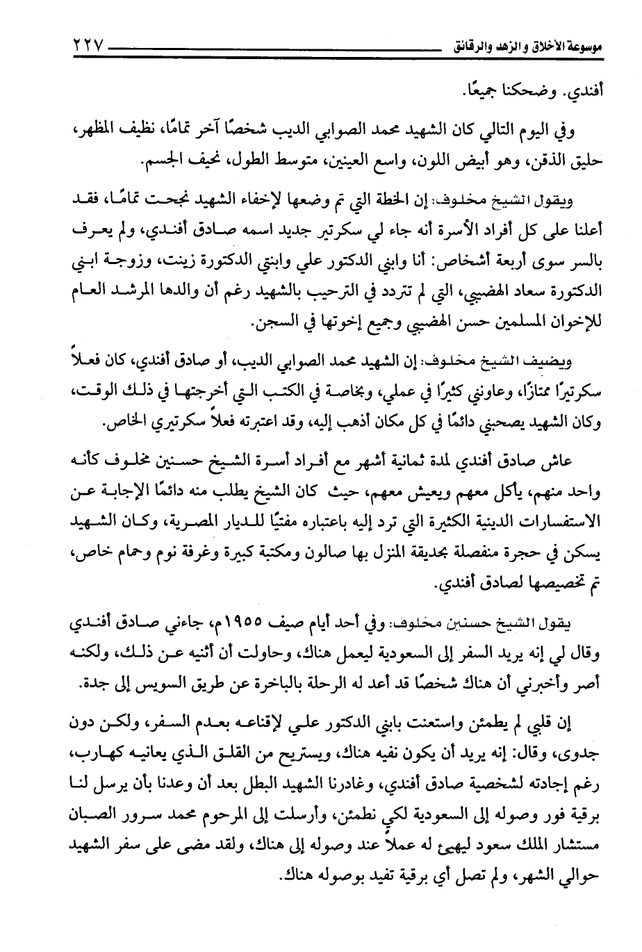 ويضيف الشيخ مخلوف: إن الشهيد محمد الصوابي الديب، أو صادق أفندي، كان فعلاً سكرتيرًا ممتازًا، وعاونني كثيرًا في عملي، وبخاصة في الكتب التي أخرجتها في ذلك الوقت، وكان الشهيد يصحبني دائمًا في كل مكان أذهب إليه، وقد اعتبرته فعلاً سكرتيري الخاص.