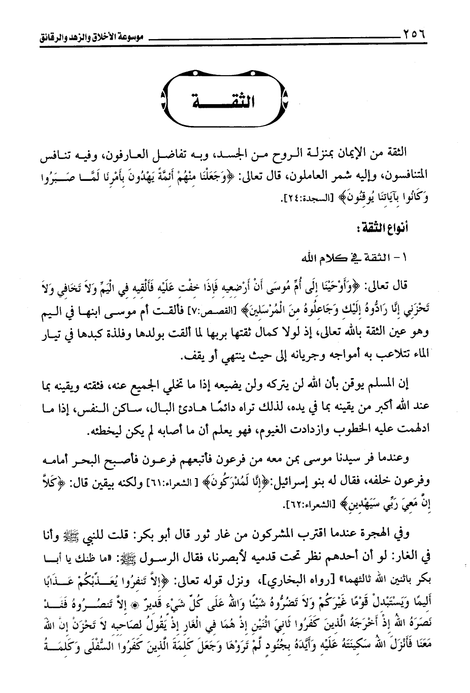 قال تعالى: {وَأَوْحَيْنَا إِلَى أُمِّ مُوسَى أَنْ أَرْضِعِيهِ فَإِذَا خِفْتِ عَلَيْهِ فَأَلْقِيهِ فِي الْيَمِّ وَلَا تَخَافِي وَلَا تَحْزَنِي إِنَّا رَادُّوهُ إِلَيْكِ وَجَاعِلُوهُ مِنَ الْمُرْسَلِينَ} [القصص: 7] فألقت أم موسى ابنها في اليم وهو عين الثقة بالله تعالى، إذ لولا كمال ثقتها بربها لما ألقت بولدها وفلذة كبدها في تيار الماء تتلاعب به أمواجه وجريانه إلى حيث ينتهي أو يقف.