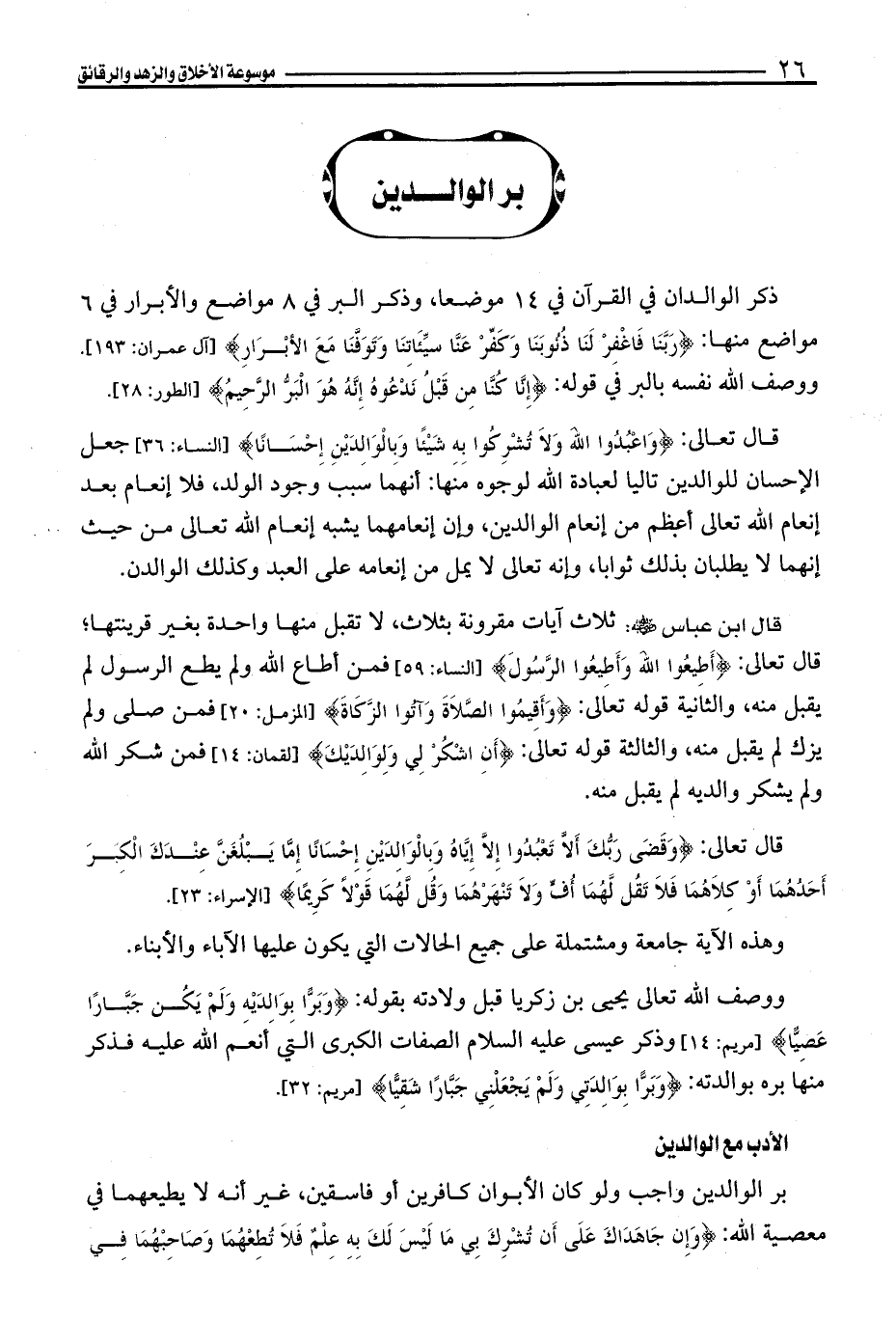 ذكر الوالدان في القرآن في 14 موضعا، وذكر البر في 8 مواضع والأبرار في 6 مواضع منها: {رَبَّنَا فَاغْفِرْ لَنَا ذُنُوبَنَا وَكَفِّرْ عَنَّا سَيِّئَاتِنَا وَتَوَفَّنَا مَعَ الْأَبْرَارِ} [آل عمران: 193].