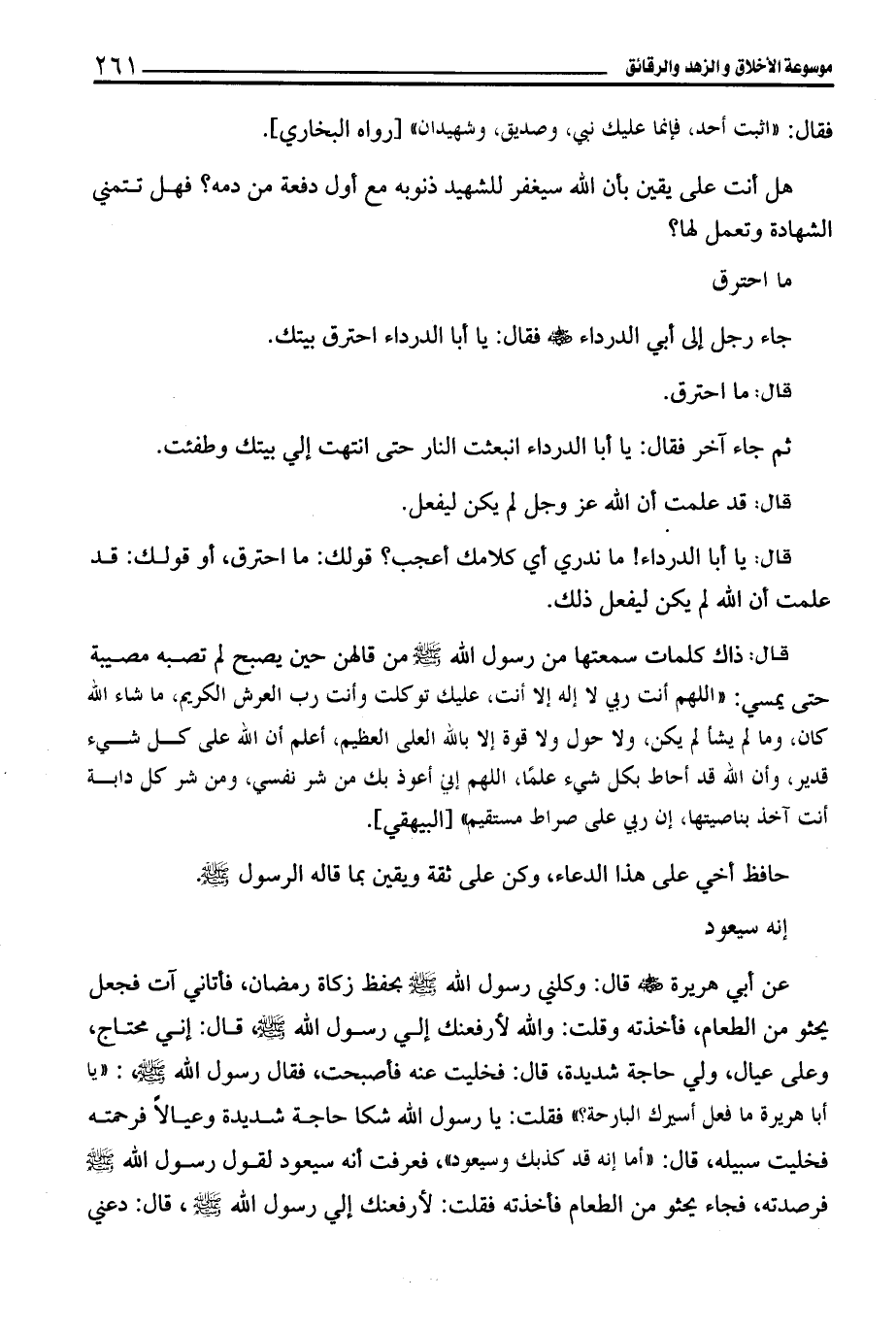قال: ذاك كلمات سمعتها من رسول الله - صلى الله عليه وسلم - من قالهن حين يصبح لم تصبه مصيبة حتى يمسي: "اللهم أنت ربي لا إله إلا أنت، عليك توكلت وأنت رب العرش الكريم، ما شاء الله كان، وما لم يشأ لم يكن، ولا حول ولا قوة إلا بالله العلى العظيم، أعلم أن الله على كل شيء قدير، وأن الله قد أحاط بكل شيء علمًا، اللهم إني أعوذ بك من شر نفسي، ومن شر كل دابة أنت آخذ بناصيتها، إن ربي على صراط مستقيم" [البيهقي].