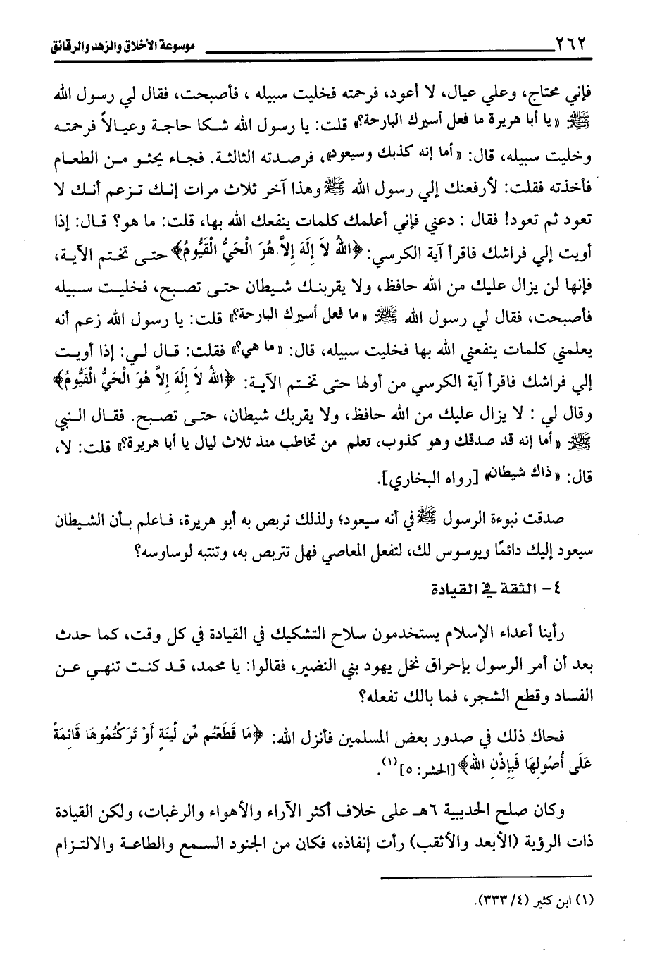 فإني محتاج، وعلي عيال، لا أعود، فرحمته فخليت سبيله، فأصبحت، فقال لي رسول الله - صلى الله عليه وسلم - "يا أبا هريرة ما فعل أسيرك البارحة؟ " قلت: يا رسول الله شكا حاجة وعيالاً فرحمته وخليت سبيله، قال: "أما إنه كذبك وسيعود"، فرصدته الثالثة. فجاء يحثو من الطعام فأخذته فقلت: لأرفعنك إلي رسول الله - صلى الله عليه وسلم - وهذا آخر ثلاث مرات إنك تزعم أنك لا تعود ثم تعود! فقال: دعني فإني أعلمك كلمات ينفعك الله بها، قلت: ما هو؟ قال: إذا أويت إلي فراشك فاقرأ آية الكرسي: {اللَّهُ لَا إِلَهَ إِلَّا هُوَ الْحَيُّ الْقَيُّومُ} [البقرة: 255] حتى تختم الآية، فإنها لن يزال عليك من الله حافظ، ولا يقربنك شيطان حتى تصبح، فخليت سبيله فأصبحت، فقال لي رسول الله - صلى الله عليه وسلم - "ما فعل أسيرك البارحة؟ " قلت: يا رسول الله زعم أنه يعلمني كلمات ينفعني الله بها فخليت سبيله، قال: "ما هي؟ " فقلت: قال لي: إذا أويت إلي فراشك فاقرأ آية الكرسي من أولها حتى تختم الآية: {اللَّهُ لَا إِلَهَ إِلَّا هُوَ الْحَيُّ الْقَيُّومُ} [البقرة: 255] وقال لي: لا يزال عليك من الله حافظ، ولا يقربك شيطان، حتى تصبح. فقال النبي - صلى الله عليه وسلم - "أما إنه قد صدقك وهو كذوب، تعلم من تخاطب منذ ثلاث ليال يا أبا هريرة؟ " قلت لا، قال: "ذاك شيطان" [رواه البخاري].