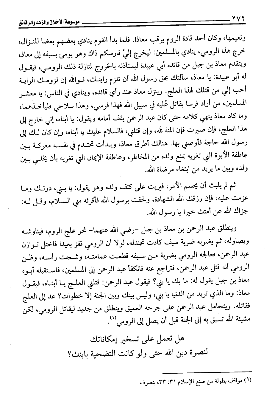 ونعيمها، وكان أحد قادة الروم يرقب معاذا. فلما بدأ القوم ينادي بعضهم بعضا للنزال، خرج هذا الرومي، ينادي بالمسلمين: ليخرج إليَّ فارسكم ذاك وهو يوميء بسيفه إلى معاذ، ويتقدم معاذ بن جبل من قائده أبي عبيدة ليستأذنه بالخروج لمنازلة ذلك الرومي، فيقول له أبو عبيدة: يا معاذ، سألتك بحق رسول الله أن تلزم رايتك، فوالله إن لزومك الراية أحب إلي من قتلك لهذا العلج. وينزل معاذ عند رأي قائده، وينادي في الناس: يا معشر المسلمين، من أراد فرسا يقاتل عليه في سبيل الله فهذا فرسي، وهذا سلاحي فليأخذهما، وما كاد معاذ ينهي كلامه حتى كان عبد الرحمن يقف أمامه ويقول: يا أبتاه، إني خارج إلى هذا العلج، فإن صبرت فإن المنة لله، وإن قتلني، فالسلام عليك يا أبتاه، وإن كان لك إلى رسول الله حاجة فأوصني بها. هنالك أطرق معاذ، وبدأت تحتدم في نفسه معركة بين عاطفة الأبوة التي تغريه بمنع ولده من المخاطر، وعاطفة الإيمان التي تغريه بأن يخلي بين ولده وبين ما يريد من ابتغاء مرضاة الله.