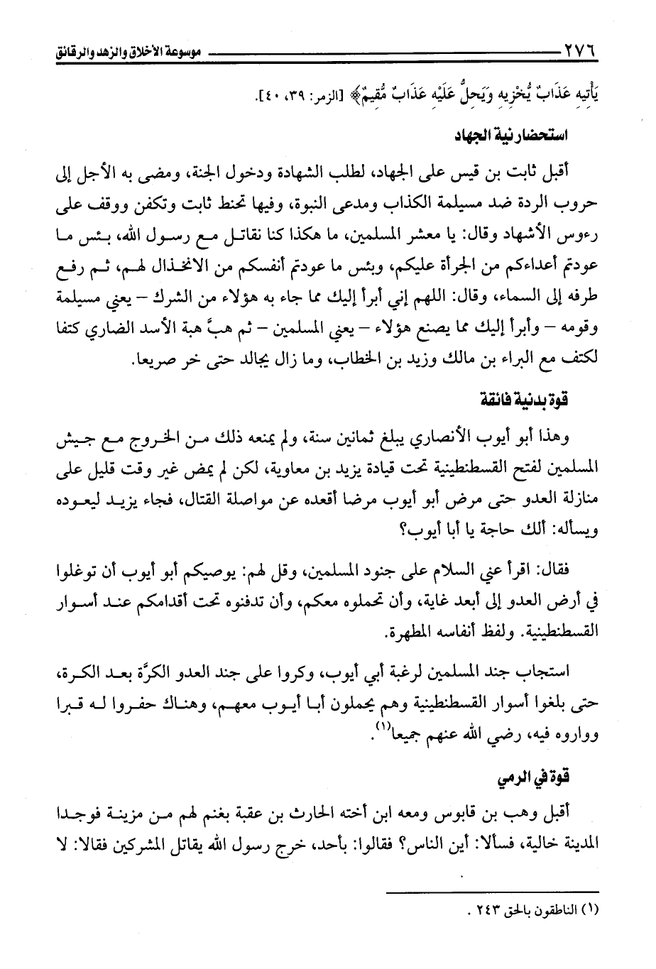 وهذا أبو أيوب الأنصاري يبلغ ثمانين سنة، ولم يمنعه ذلك من الخروج مع جيش المسلمين لفتح القسطنطينية تحت قيادة يزيد بن معاوية، لكن لم يمض غير وقت قليل على منازلة العدو حتى مرض أبو أيوب مرضا أقعده عن مواصلة القتال، فجاء يزيد ليعوده ويسأله: ألك حاجة يا أبا أيوب؟