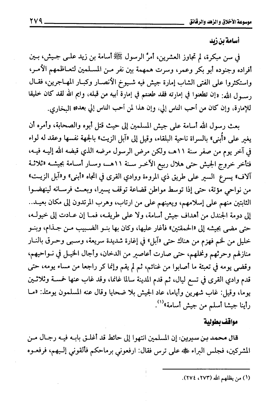 في سن مبكرة، لم تجاوز العشرين، أمرَّ الرسول - صلى الله عليه وسلم - أسامة بن زيد على جيش، بين أفراده وجنوده أبو بكر وعمر، وسرت همهمة بين نفر من المسلمين لتعاظمهم الأمر، واستكثروا على الفتى الشاب إمارة جيش فيه شيوخ الأنصار وكبار المهاجرين، فقال رسول الله: "إن تطعنوا في إمارته فقد طعنتم في إمارة أبيه من قبله، وايم الله لقد كان خليقا للإمارة، وإن كان من أحب الناس إلي، وإن هذا لن أحب الناس إلي بعده" البخاري.