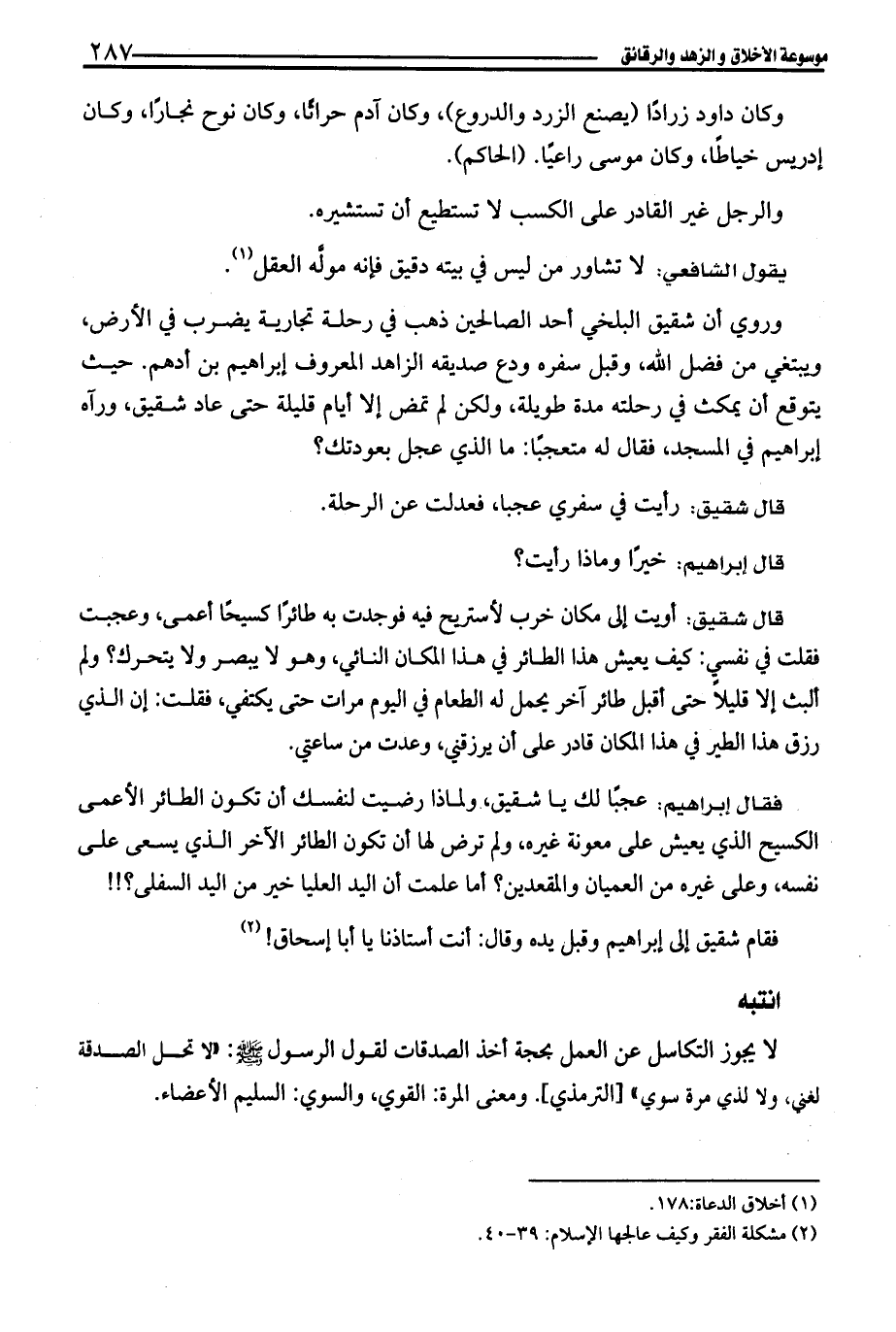 فقال إبراهيم: عجبًا لك يا شقيق، ولماذا رضيت لنفسك أن تكون الطائر الأعمى الكسيح الذي يعيش على معونة غيره، ولم ترض لها أن تكون الطائر الآخر الذي يسعى على نفسه، وعلى غيره من العميان والمقعدين؟ أما علمت أن اليد العليا خير من اليد السفلى؟!!