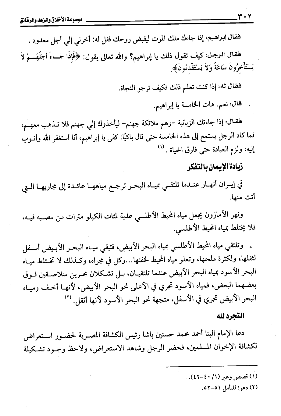 فقال: إذا جاءتك الزبانية -وهم ملائكة جهنم- ليأخذوك إلي جهنم فلا تذهب معهم، فما كاد الرجل يستمع إلى هذه الخامسة حتى قال باكيًا: كفى يا إبراهيم، أنا أستغفر الله وأتوب إليه، ولزم العبادة حتى فارق الحياة. (¬1)