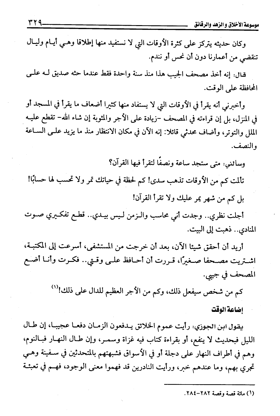 وكان حديثه يتركز على كثرة الأوقات التي لا نستفيد منها إطلاقا وهي أيام وليال تنقضي من أعمارنا دون أن نحس أو نندم.