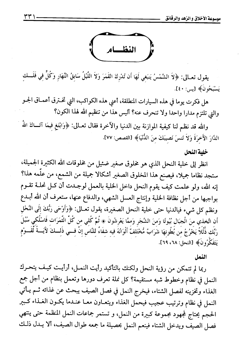 انظر إلى خلية النحل الذي هو مخلوق صغير ضئيل من مخلوقات الله الكثيرة الجميلة، ستجد نظاما جميلا، فيصنع هذا المخلوق الصغير أشكالا جميلة من الشمع، من علّمه هذا؟ إنه الله، ولو علمت كيف يقوم النحل داخل الخلية بالعمل لوجدت أن كل نحلة تقوم بواجبها من أجل نظافة الخلية وإنتاج العسل الشهي، والدفاع عنها، ستعرف أن الله أبدع ونظم كل شيء فيالدنيا حتى خلية النحل الصغيرة، يقول تعالى: {وَأَوْحَى رَبُّكَ إِلَى النَّحْلِ أَنِ اتَّخِذِي مِنَ الْجِبَالِ بُيُوتًا وَمِنَ الشَّجَرِ وَمِمَّا يَعْرِشُونَ (68) ثُمَّ كُلِي مِنْ كُلِّ الثَّمَرَاتِ فَاسْلُكِي سُبُلَ رَبِّكِ ذُلُلًا يَخْرُجُ مِنْ بُطُونِهَا شَرَابٌ مُخْتَلِفٌ أَلْوَانُهُ فِيهِ شِفَاءٌ لِلنَّاسِ إِنَّ فِي ذَلِكَ لَآيَةً لِقَوْمٍ يَتَفَكَّرُونَ (69)} [النحل: 68 - 69].