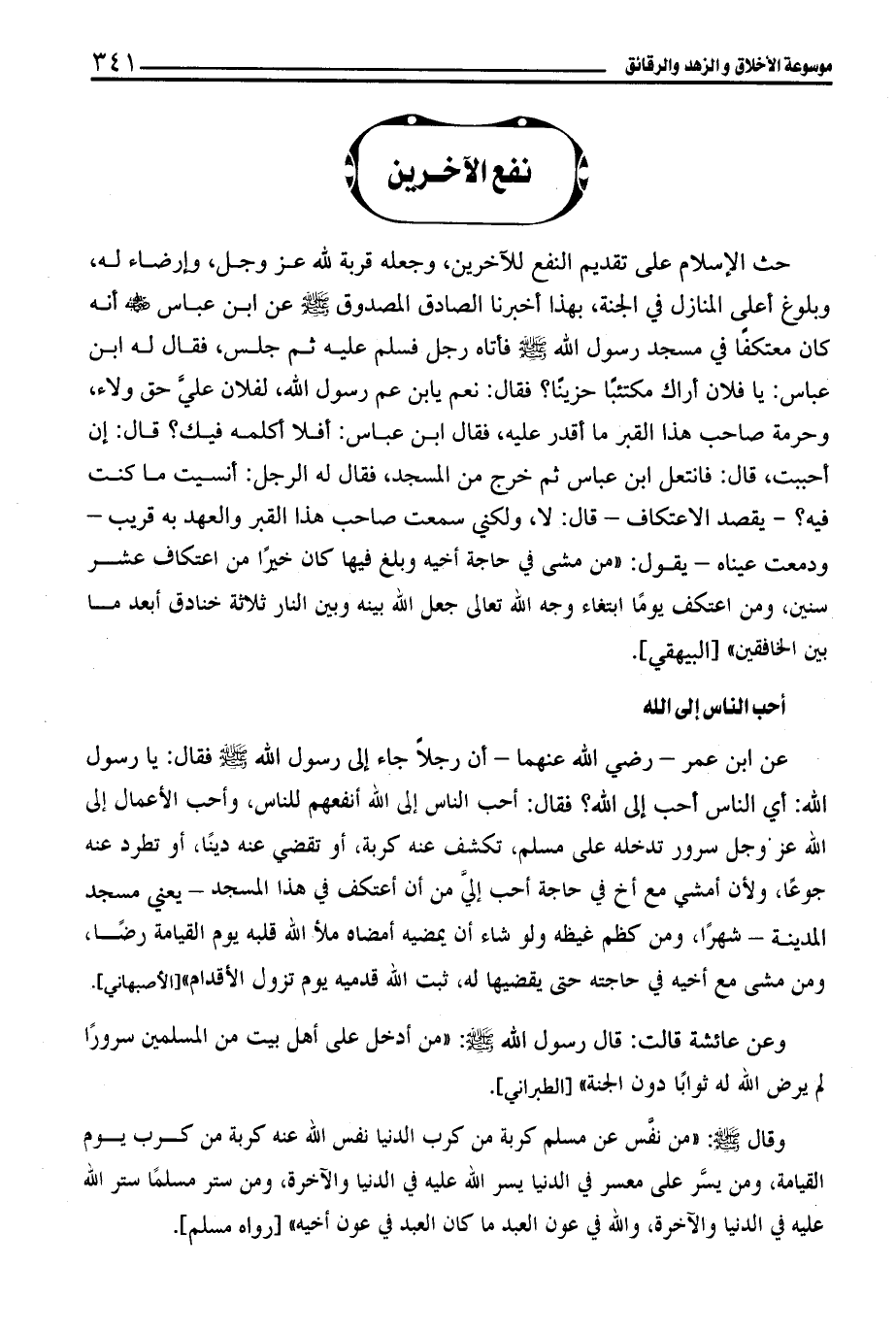 حث الإسلام على تقديم النفع للآخرين، وجعله قربة لله عز وجل، وإرضاء له، وبلوغ أعلى المنازل في الجنة، بهذا أخبرنا الصادق المصدوق - صلى الله عليه وسلم - عن ابن عباس - رضي الله عنه - أنه كان معتكفًا في مسجد رسول الله - صلى الله عليه وسلم - فأتاه رجل فسلم عليه ثم جلس، فقال له ابن عباس: يا فلان أراك مكتئبًا حزينًا؟ فقال: نعم يابن عم رسول الله، لفلان علي حق ولاء، وحرمة صاحب هذا القبر ما أقدر عليه، فقال ابن عباس: أفلا أكلمه فيك؟ قال: إن أحببت، قال: فانتعل ابن عباس ثم خرج من المسجد، فقال له الرجل: أنسيت ما كنت فيه؟ -يقصد الاعتكاف- قال: لا، ولكني سمعت صاحب هذا القبر والعهد به قريب -ودمعت عيناه- يقول: "من مشى في حاجة أخيه وبلغ فيها كان خيرًا من اعتكاف عشر سنين، ومن اعتكف يومًا ابتغاء وجه الله تعالى جعل الله بينه وبين النار ثلاثة خنادق أبعد ما بين الخافقين" [البيهقي].