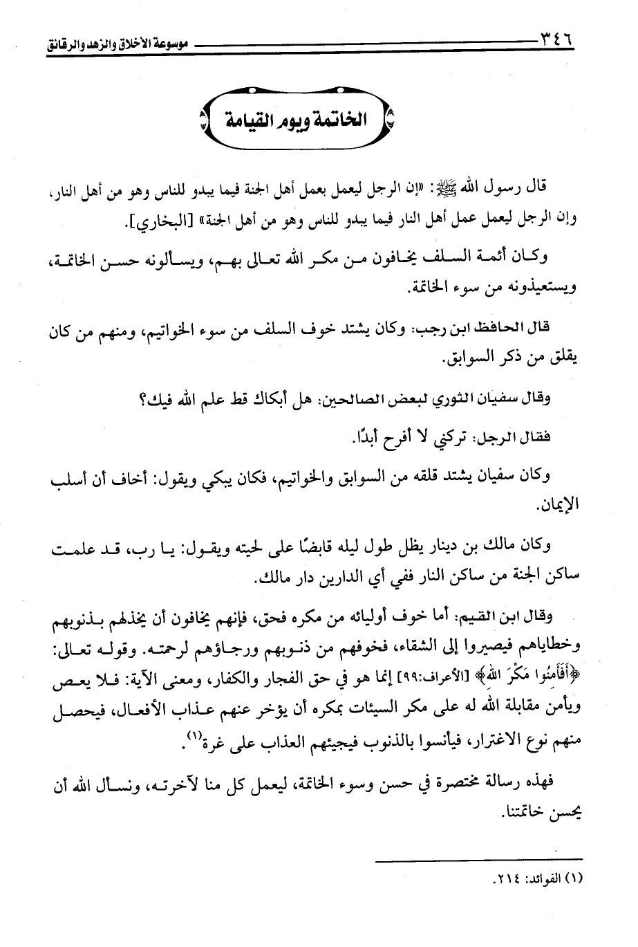 فهذه رسالة مختصرة في حسن وسوء الخاتمة، ليعمل كل منا لآخرته، ونسأل الله أن يحسن خاتمتنا.