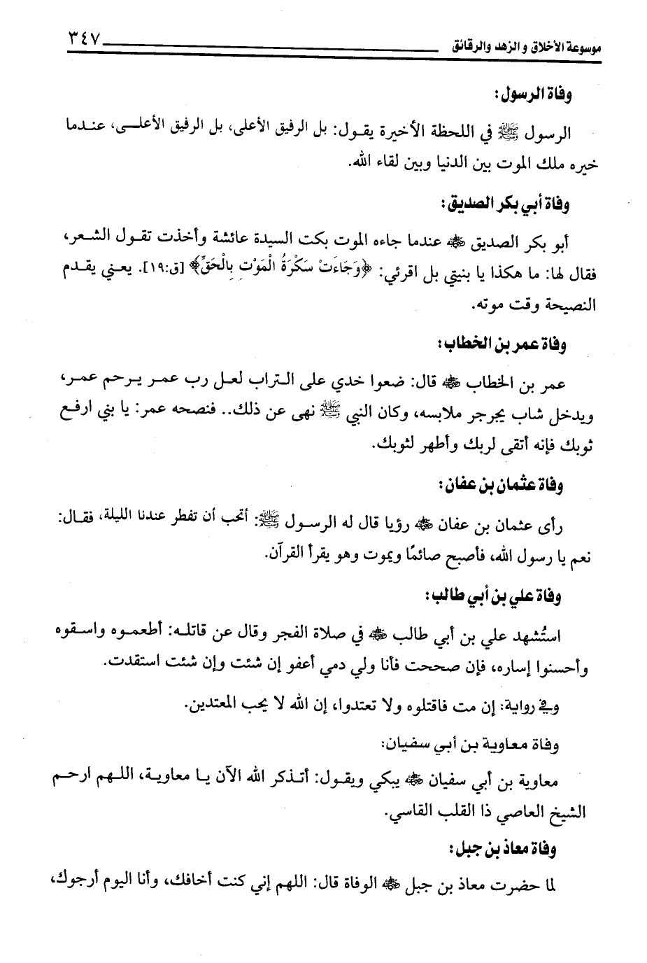 أبو بكر الصديق - رضي الله عنه - عندما جاءه الموت بكت السيدة عائشة وأخذت تقول الشعر، فقال لها: ما هكذا يا بنيتي بل اقرئي: {وَجَاءَتْ سَكْرَةُ الْمَوْتِ بِالْحَقِّ} [ق: 19]. يعني يقدم النصيحة وقت موته.