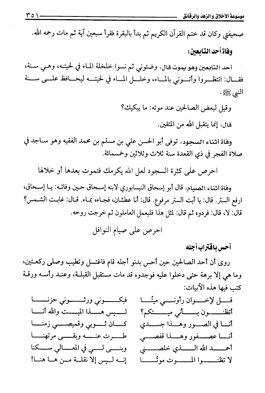 روى أن أحد الصالحين حين أحس بدنو أجله قام فاغتسل وتطيب وصلى ركعتين، وما هي إلا برهة حتى دخلوا عليه فوجدوه قد مات مستقبل القبلة، وعند رأسه ورقة كتب فيها هذه الأبيات: