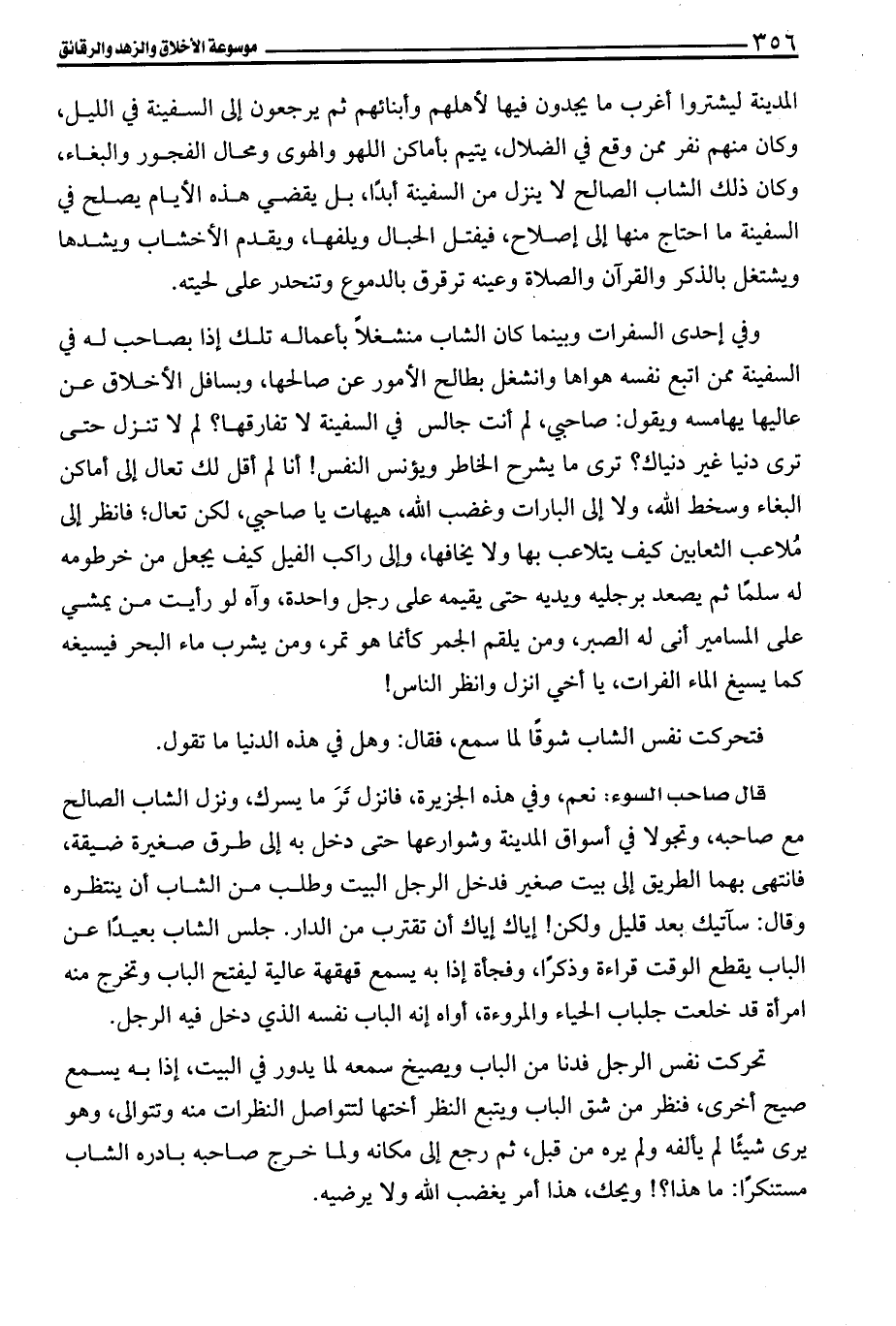 المدينة ليشتروا أغرب ما يجدون فيها لأهلهم وأبنائهم ثم يرجعون إلى السفينة في الليل، وكان منهم نفر ممن وقع في الضلال، يتيم بأماكن اللهو والهوى ومحال الفجور والبغاء، وكان ذلك الشاب الصالح لا ينزل من السفينة أبدا، بل يقضي هذه الأيام يصلح في السفينة ما احتاج منها إلى إصلاح، فيفتل الحبال ويلفها، ويقدم الأخشاب ويشدها ويشتغل بالذكر والقرآن والصلاة وعينه ترقرق بالدموع وتنحدر على لحيته.