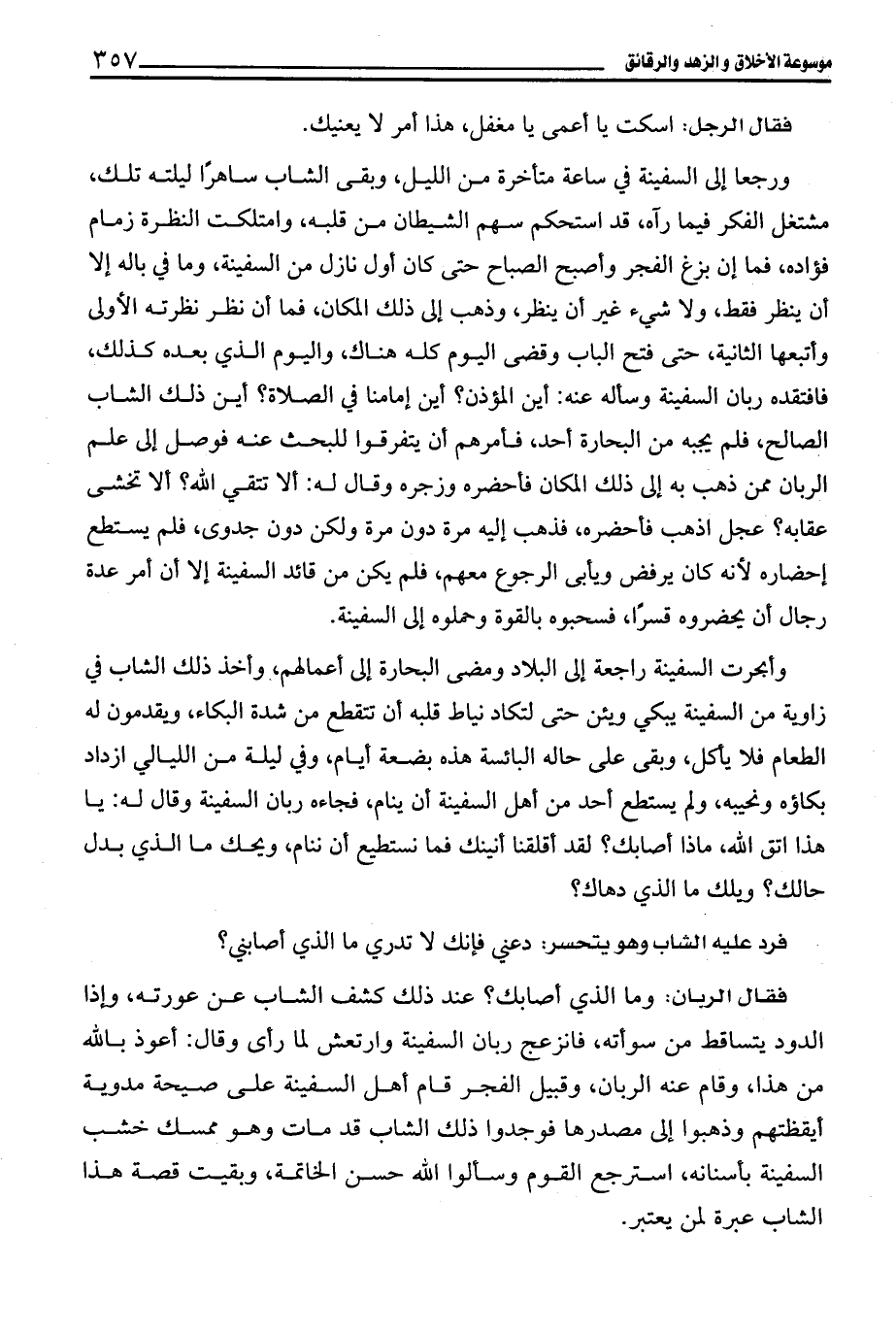 ورجعا إلى السفينة في ساعة متأخرة من الليل، وبقى الشاب ساهرًا ليلته تلك، مشتغل الفكر فيما رآه، قد استحكم سهم الشيطان من قلبه، وامتلكت النظرة زمام فؤاده، فما إن بزغ الفجر وأصبح الصباح حتى كان أول نازل من السفينة، وما في باله إلا أن ينظر فقط، ولا شيء غير أن ينظر، وذهب إلى ذلك المكان، فما أن نظر نظرته الأولى وأتبعها الثانية، حتى فتح الباب وقضى اليوم كله هناك، واليوم الذي بعده كذلك، فافتقده ربان السفينة وسأله عنه: أين المؤذن؟ أين إمامنا في الصلاة؟ أين ذلك الشاب الصالح، فلم يجبه من البحارة أحد، فأمرهم أن يتفرقوا للبحث عنه فوصل إلى علم الربان ممن ذهب به إلى ذلك المكان فأحضره وزجره وقال له: ألا تتقي الله؟ ألا تخشى عقابه؟ عجل اذهب فأحضره، فذهب إليه مرة دون مرة ولكن دون جدوى، فلم يستطع إحضاره لأنه كان يرفض ويأبى الرجوع معهم، فلم يكن من قائد السفينة إلا أن أمر عدة رجال أن يحضروه قسرًا، فسحبوه بالقوة وحملوه إلى السفينة.