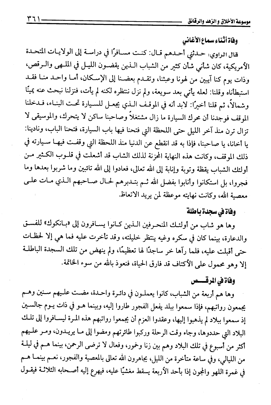 قال الراوي: حدثني أحدهم قال: كنت مسافرًا في دراسة إلى الولايات المتحدة الأمريكية، كان شأني شأن كثير من الشباب الذين يقضون الليل في الملهى والرقص، وذات يوم كنا آيبين من لهونا وعبثنا، وتقدم بعضنا إلى الإسكان، أما واحد منا فقد استبطانأه وقلنا: لعله يأتي بعد سويعة، ولم نزل ننتظره لكنه لم يأت، فنزلنا نبحث عنه يمينًا وشمالاً، ثم قلنا أخيرًا: لابد أنه في الموقف الذي يجعل للسيارة تحت البناء، فدخلنا الموقف فوجدنا أن محرك السيارة ما زال مشتغلاً وصاحبنا ساكن لا يتحرك، والموسيقى لا تزال ترن منذ آخر الليل حتى اللحظة التي فتحنا فيها باب السيارة، فتحنا الباب، ونادينا: يا أخانا، يا صاحبنا، فإذا به قد انقطع عن الدنيا منذ اللحظة التي وقفت فيها سيارته في ذلك الموقف، وكانت هذه النهاية المحزنة لذلك الشاب قد أشعلت في قلوب الكثير من أولئك الشباب يقظة وتوبة وإنابة إلى الله تعالى، فعادوا إلى الله تائبين وما شربوا بعدها وما فجروا، بل استكانوا وأنابوا بفضل الله ثم بتدبرهم لحال صاحبهم الذي مات على معصية الله، وكانت نهايته موعظة لمن يريد الاتعاظ.