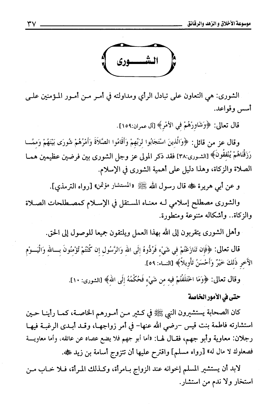 وقال عز من قائل: {وَالَّذِينَ اسْتَجَابُوا لِرَبِّهِمْ وَأَقَامُوا الصَّلَاةَ وَأَمْرُهُمْ شُورَى بَيْنَهُمْ وَمِمَّا رَزَقْنَاهُمْ يُنْفِقُونَ} [الشورى: 38] فقد ذكر المولى عز وجل الشورى بين فرضين عظيمين هما الصلاة والزكاة، وهذا دليل على أهمية الشورى في الإسلام.