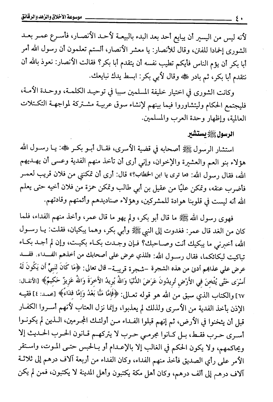 استشار الرسول - صلى الله عليه وسلم - أصحابه في قضية الأسرى، فقال أبو بكر - رضي الله عنه -: يا رسول الله هؤلاء بنو العم والعشيرة والإخوان، وإني أرى أن تأخذ منهم الفدية وعسى أن يهديهم الله، فقال رسول الله: "ما ترى يا ابن الخطاب؟ " قال: أرى أن تمكنني من فلان قريب لعمر فأضرب عنقه، وتمكن عليا من عقيل بن أبي طالب وتمكن حمزة من فلان أخيه حتى يعلم الله أنه ليست في قلوبنا هوادة للمشركين، وهؤلاء صناديدهم وأئمتهم وقادتهم.