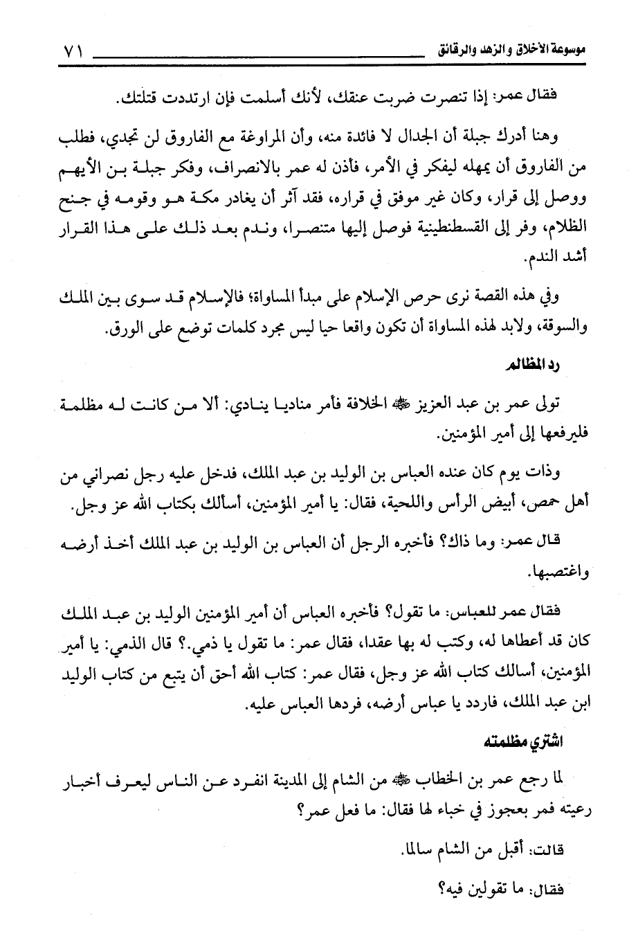 فقال عمر للعباس: ما تقول؟ فأخبره العباس أن أمير المؤمنين الوليد بن عبد الملك كان قد أعطاها له، وكتب له بها عقدا، فقال عمر: ما تقول يا ذمي.؟ قال الذمي: يا أمير المؤمنين، أسألك كتاب الله عز وجل، فقال عمر: كتاب الله أحق أن يتبع من كتاب الوليد ابن عبد الملك، فاردد يا عباس أرضه، فردها العباس عليه.