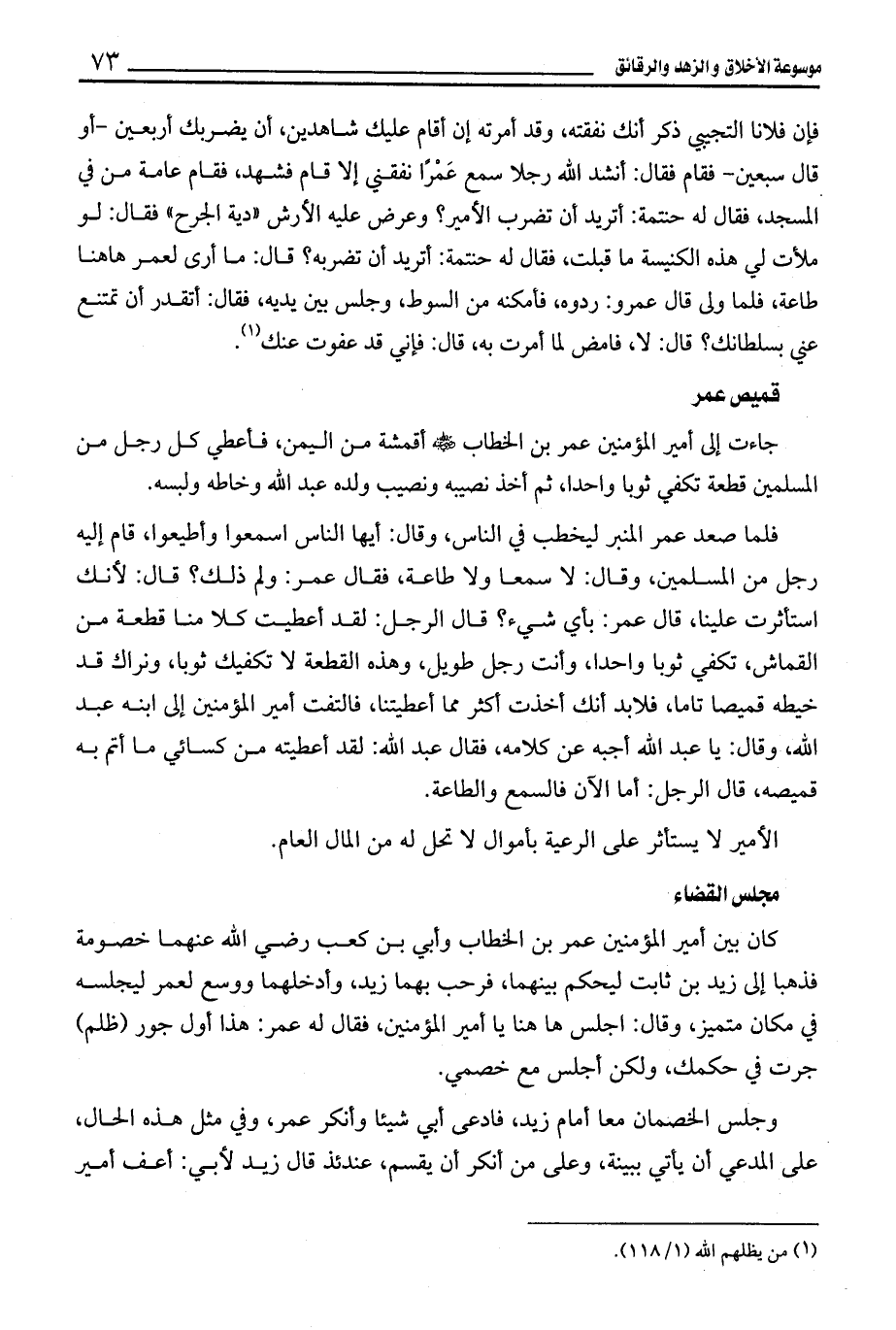 وجلس الخصمان معا أمام زيد، فادعى أبي شيئا وأنكر عمر، وفي مثل هذه الحال، على المدعي أن يأتي ببينة، وعلى من أنكر أن يقسم، عندئذ قال زيد لأبي: أعف أمير