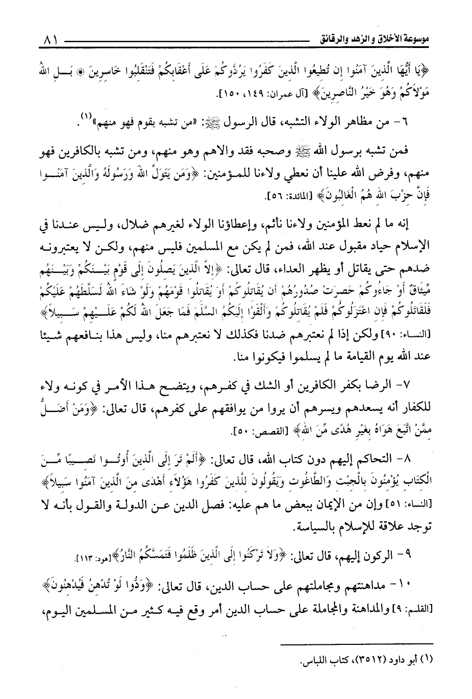 9 - الركون إليهم، قال تعالى: {وَلَا تَرْكَنُوا إِلَى الَّذِينَ ظَلَمُوا فَتَمَسَّكُمُ النَّارُ} [هود: 113].