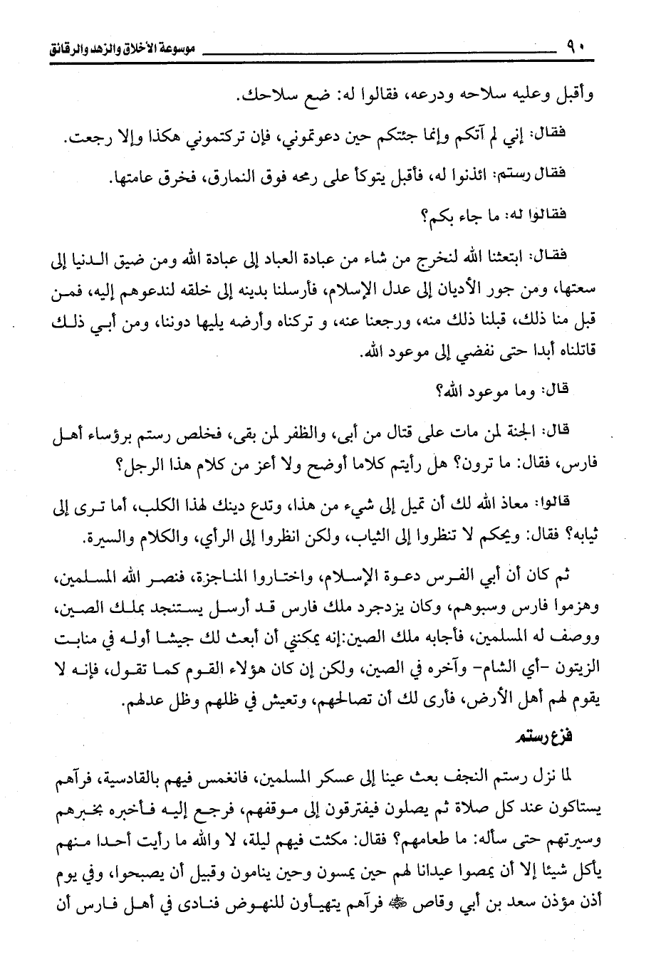 قال: الجنة لمن مات على قتال من أبى، والظفر لمن بقى، فخلص رستم برؤساء أهل فارس، فقال: ما ترون؟ هل رأيتم كلاما أوضح ولا أعز من كلام هذا الرجل؟