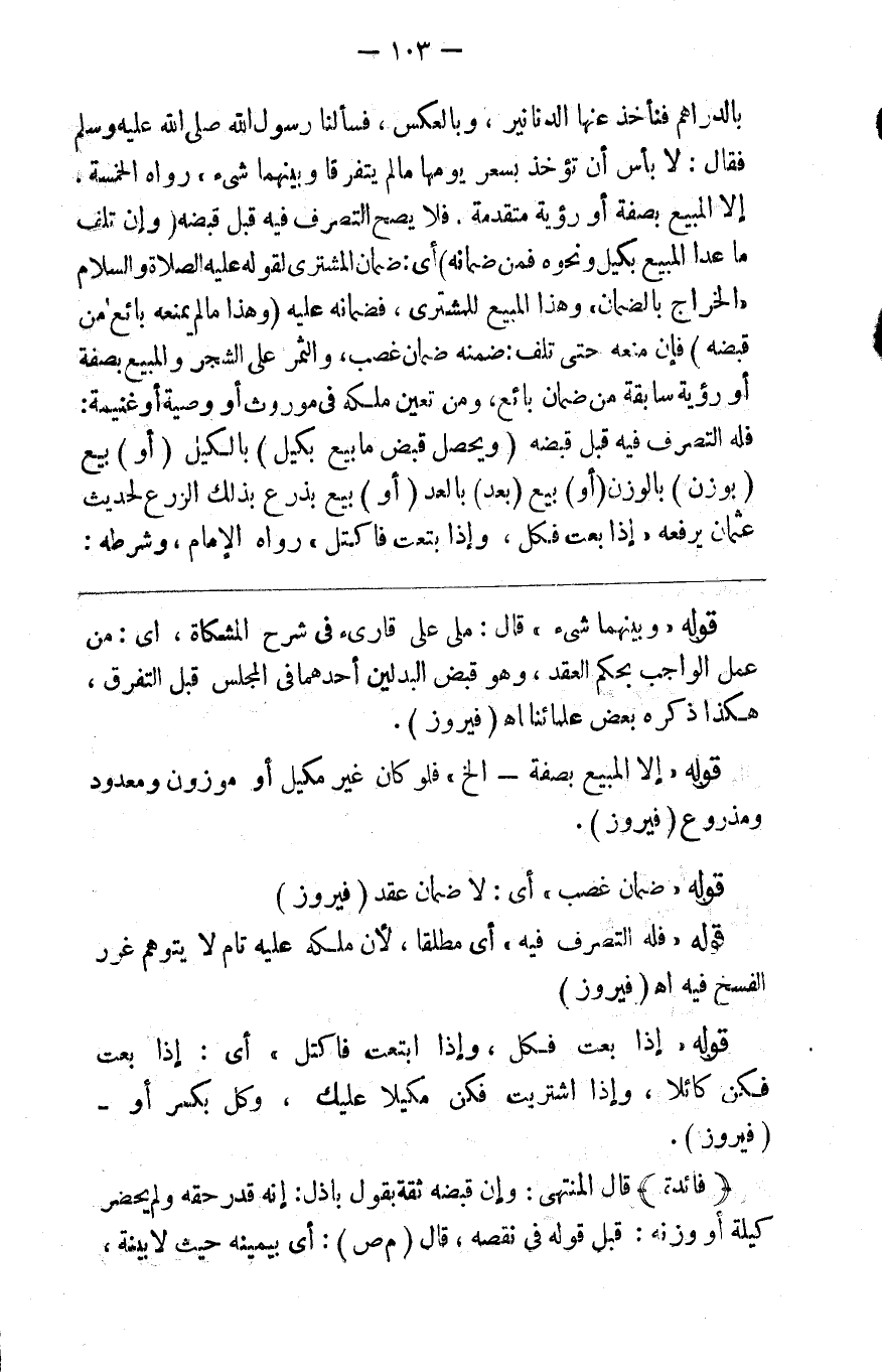 فنأخذ عنها الدنانير وبالعكس فسألنا رسول الله صلى الله عليه وسلم فقال لا بأس أن تؤخذ بسعر يومها ما لم يفترقا وبينهما شيء رواه الخمسة إلا المبيع بصفة أو رؤية متقدمة فلا يصح التصرف فيه قبل قبضه ( وإن تلف ما عدا المبيع بكيل ونحوه فمن ضمانه ) أي ضمان المشتري لقوله صلى الله عليه وسلم الخراج بالضمان وهذا المبيع للمشتري فضمانه عليه وهذا ( مالم يمنعه بائع من قبضه ) فإن منعه حتى تلف ضمنه ضمان غصب والثمر على الشجر والمبيع بصفة أو رؤية سابقة من ضمان بائع ومن تعين ملكه في موروث أو وصية أو غنيمة فله التصرف فيه قبل قبضه ( ويحصل قبض ما بيع بكيل ) بالكيل ( أو ) بيع ب ( وزن ) بالوزن ( أو ) بيع ب ( عد ) بالعد ( أو ) بيع ب ( ذرع ذلك ) الذرع لحديث عثمان يرفعه إذا بعت فكل وإذا ابتعت فاكتل رواه الإمام وشرطه