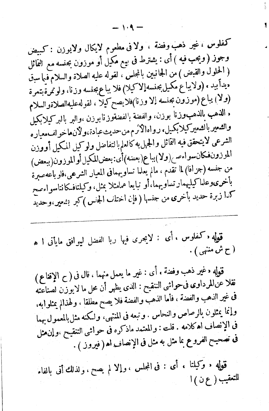 كفلوس غير ذهب وفضة ولا في مطعوم لا يكال ولا يوزن كبيض وجوز ( ويجب فيه ) أي يشترط في بيع مكيل أو موزون بجنسه مع التماثل ( الحلول والقبض ) من الجانبين بالمجلس لقوله صلى الله عليه وسلم فيما سبق يدا بيد ( ولا يباع مكيل بجنسه إلا كيلا ) فلا يباع بجنسه وزنا ولو تمرة بتمرة ( ولا ) يباع ( موزون بجنسه إلا وزنا ) فلا يصح كيلا لقوله صلى الله عليه وسلم الذهب بالذهب وزنا بوزن والفضة بالفضة وزنا بوزن والبر بالبر كيلا بكيل والشعير بالشعير كيلا بكيل رواه الأثرم من حديث عبادة بن الصامت ولأن ما خولف معياره الشرعي لا يتحقق فيه التماثل والجهل به كالعلم بالتفاضل ولو كيل المكيل أو وزن الموزون فكانا سواء صح ( ولا ) يباع ( بعضه ) أي بعض المكيل والموزون ( ببعض ) من جنسه ) ( جزافا ) لما تقدم ما لم يعلما تساويهما في المعيار الشرعي فلو باعه صبرة بأخرى وعلما كيلهما وتساويهما أو تبايعاهما مثلا بمثل وكيلتا فكانتا سواء صح وكذا زبرة حديد بأخرى من جنسها ( فإن اختلف الجنس ) كبر بشعير وحديد