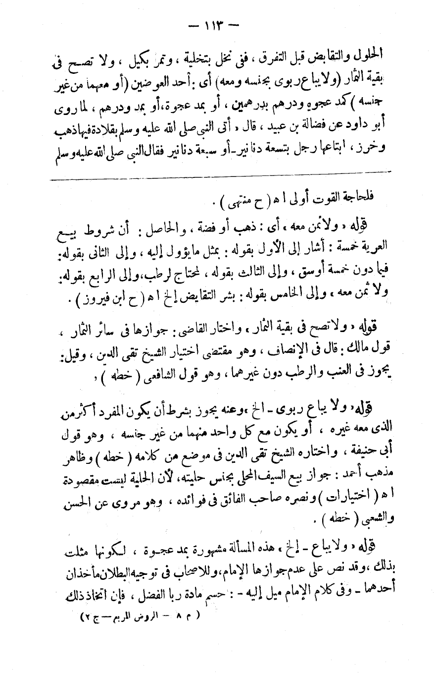 الحلول والتقابض قبل التفرق ففي نخل بتخليته وفي تمر بكيل ولايصح في بقية الثمار ( ولا يباع ربوي بجنسه ومعه ) أي مع أحد العوضين ( أو معهما من غير جنسه ) كمد عجوة ودرهم بدرهمين أو بمدي عجوة أو بمد ودرهم لما روى أبو داود عن فضالة بن عبيد قال أتي النبي صلى الله عليه وسلم بقلادة فيها ذهب وخرز ابتاعها رجل بتسعة دنانير أو سبعة دنانير فقال النبي صلى الله عليه وسلم