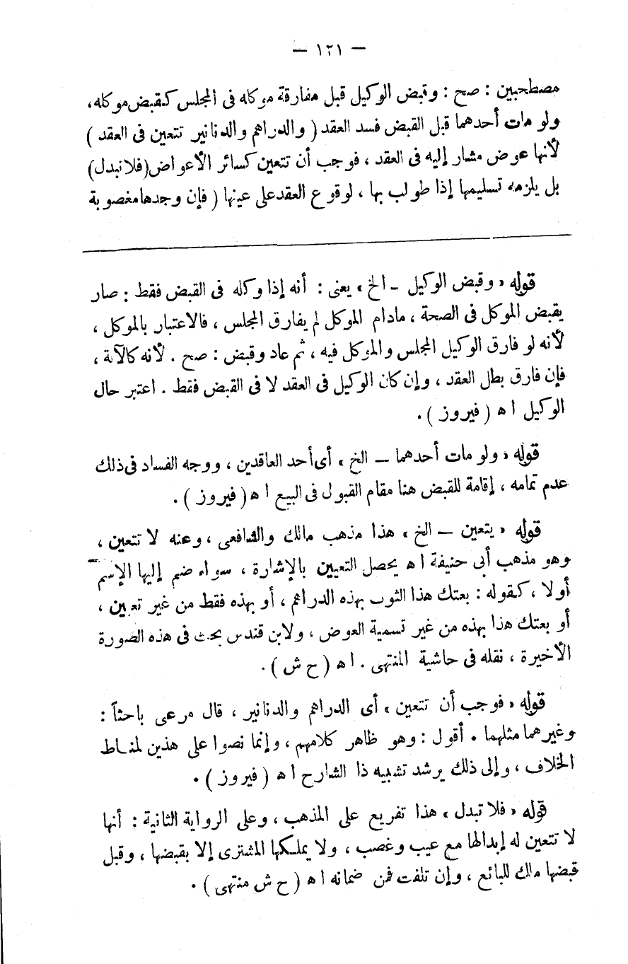 مصطحبين صح وقبض الوكيل قبل مفارقة موكله المجلس كقبض موكله ولو مات أحدهما قبل القبض فسد العقد ( والدراهم والدنانير تتعين بالتتعين في العقد ) لأنها عوض مشار إليه في العقد فوجب أن تتعين كسائر الأعواض ( فلا تتبدل ) بل يلزمه تسليمها إذا طولب بها لوقوع العقد على عينها ( فإن وجدها مغصوبة