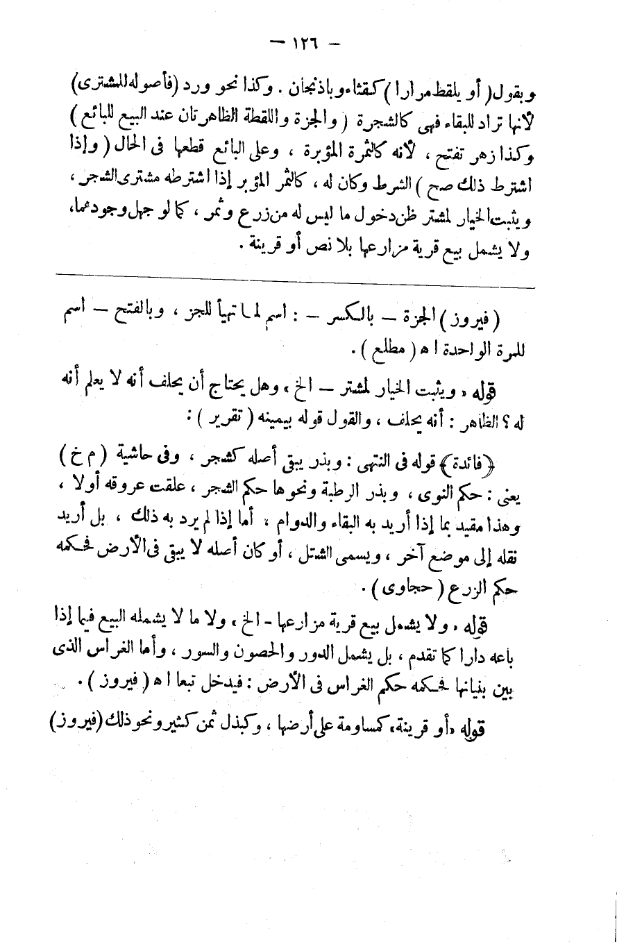 وبقول (أو يلتقط مرارا) كقثاء وباذنجان وكذا نحو ورد (فأصوله للمشتري) لأنها تراد للبقاء فهي كالشجرة (والجزة واللقطة الظاهرتان عند البيع للبائع) وكذا زهر تفتح لأنه كالثمر المؤبر وعلى البائع قطعها في الحال (وإن اشترط المشتري ذلك صح) الشرط وكان له كالثمر المؤبر إذا اشترطه مشتري الشجر ويثبت الخيار لمشتر ظن دخول ما ليس له من زرع وتمر كما لو جهل وجودهما ولا يشمل بيع قرية مزارعها بلا نص أو قرينة %