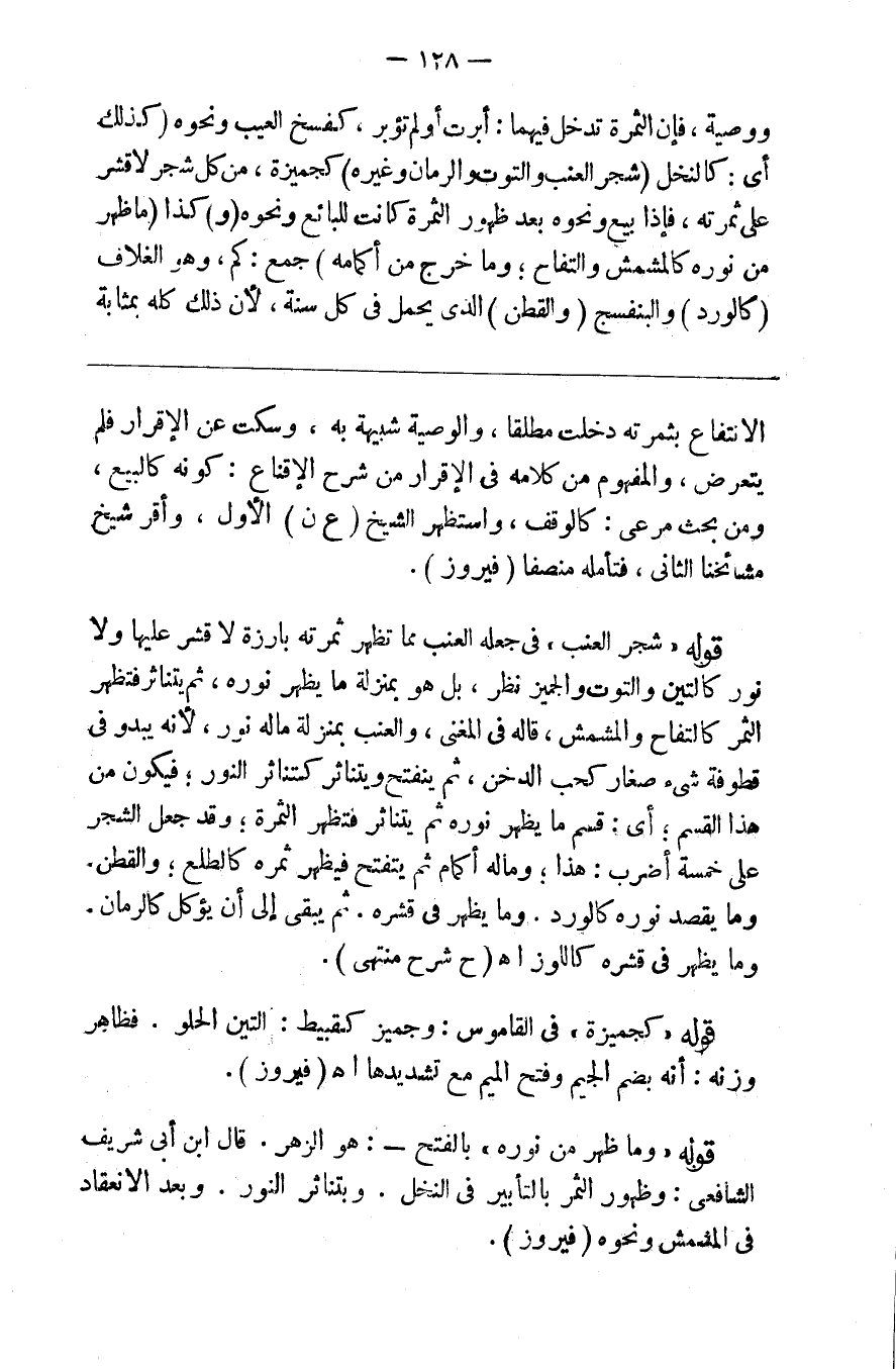 ووصية فإن الثمرة تدخل فيهما أبرت أو لم تؤبر كفسخ لعيب ونحوه (وكذلك) أي كالنخل (شجر العنب والتوت والرمان وغيره) كجميز من كل شجر لا قشر على ثمرته فإذا بيع ونحوه بعد ظهور الثمرة كانت للبائع ونحوه (و) كذا (ما ظهر من نوره كالمشمش والتفاح وما خرج من أكمامه) جمع كم وهو الغلاف (كالورد) والبنفسج (والقطن) الذي يحمل في كل سنة لأن ذلك كله بمثابة