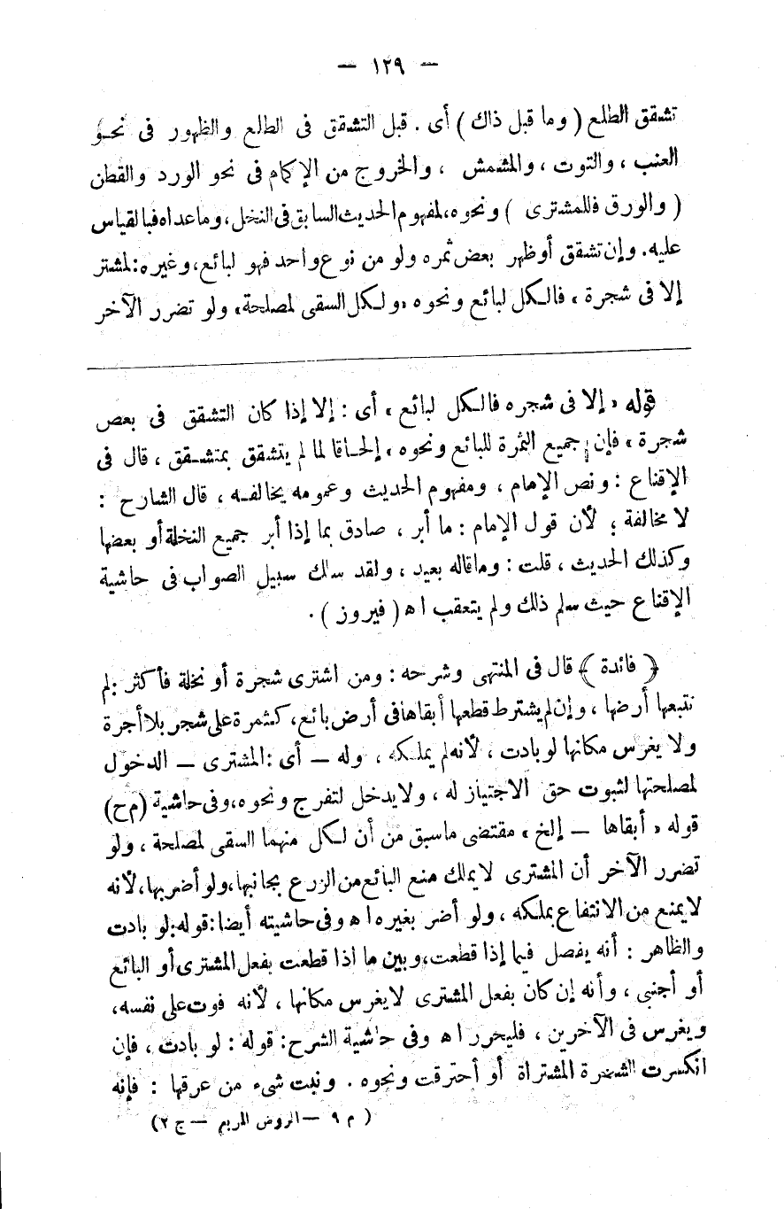 تشقق الطلع ( وما قبل ذلك ) أي قبل التشقق في الطلع والظهور في نحو العنب والتوت والمشمش والخروج من الأكمام في نحو الورد والقطن ( والورق فلمشتر ) ونحوه لمفهوم الحديث السابق في النخل وما عداه بالقياس عليه وإن تشقق أو ظهر بعض ثمره ولو من نوع واحد فهو لبائع وغيره لمشتر إلا في شجرة فالكل لبائع ونحوه ولكل السقي لمصلحة ولو تضرر الآخر