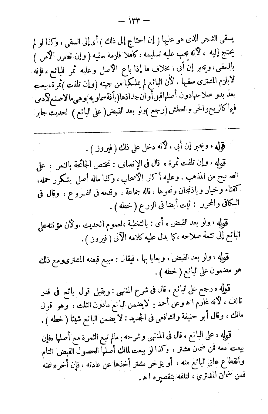 بسقي الشجر الذي هو عليها ( إن احتاج إلى ذلك ) أي إلى السقي وكذا لو لم يحتاج إليه لأنه يجب عليه تسليمه كاملا فلزمه سقيه ( وإن تضرر الأصل ) بالسقي ويجبر عليه إن أبى بخلاف ما إذا باع الأصل وعليه ثمر للبائع فإنه لا يلزم المشتري سقيها لأن البائع لم يملكها من جهته ( وإن تلفت ) ثمرة بيعت بعد بدو صلاحها دون أصلها قبل أوان جذاذها ( بآفة سماوية ) وهي ما لا صنع لآدمي فيها كالريح والحر والعطش ( رجع ) ولو بعد القبض ( على البائع ) لحديث جابر
